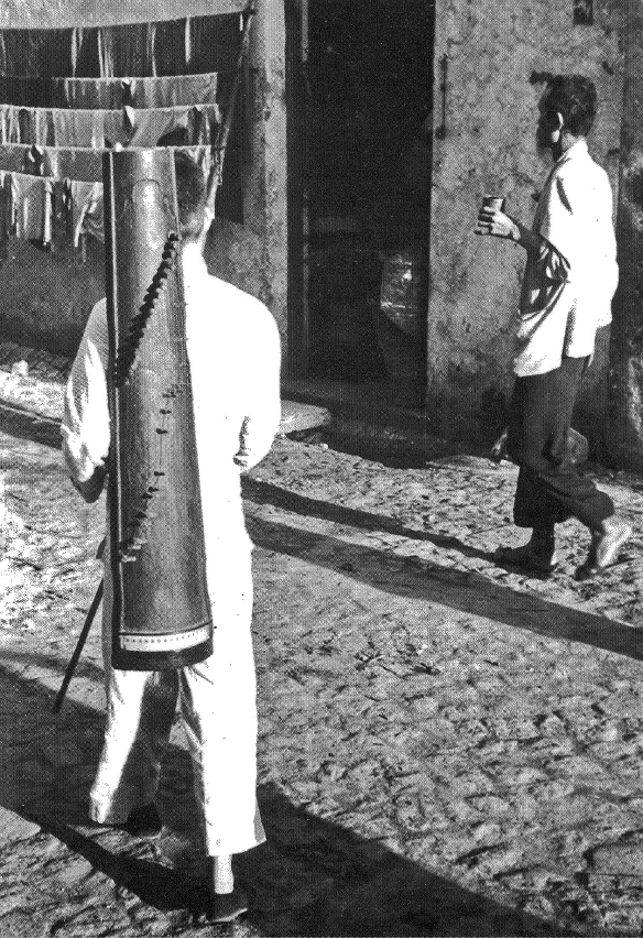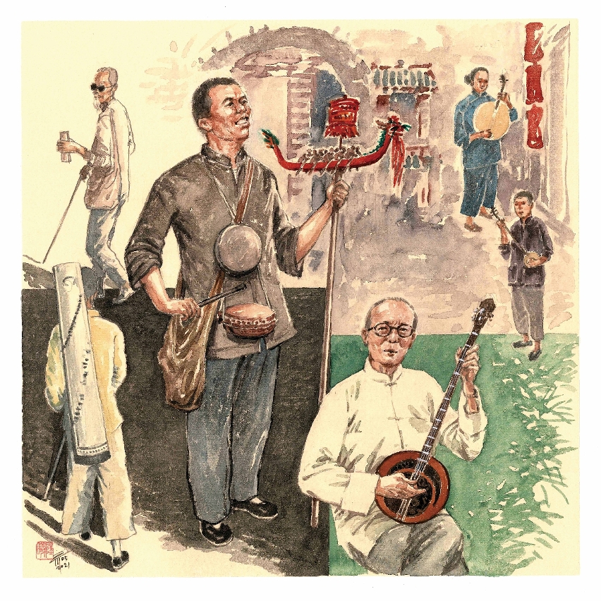 沿街卖唱谋生,自古已有,且有两种模式。一是如上述那样,沿街慢走,有客人招呼就停下来,让客人点曲,按歌曲的长短收取相对固定的酬劳;二是边走边唱,在打开门的商铺与民宅前停留片刻,唱几句,获得赏钱就转到下一户,其唱奏只为引人注意,很少为某户人家唱完一曲,带行乞性质。两者性质不完全一样,演出时间亦有显着差异。卖唱者能保有更多的自尊心,多活跃于夜后,乞赏者则在白天活动。