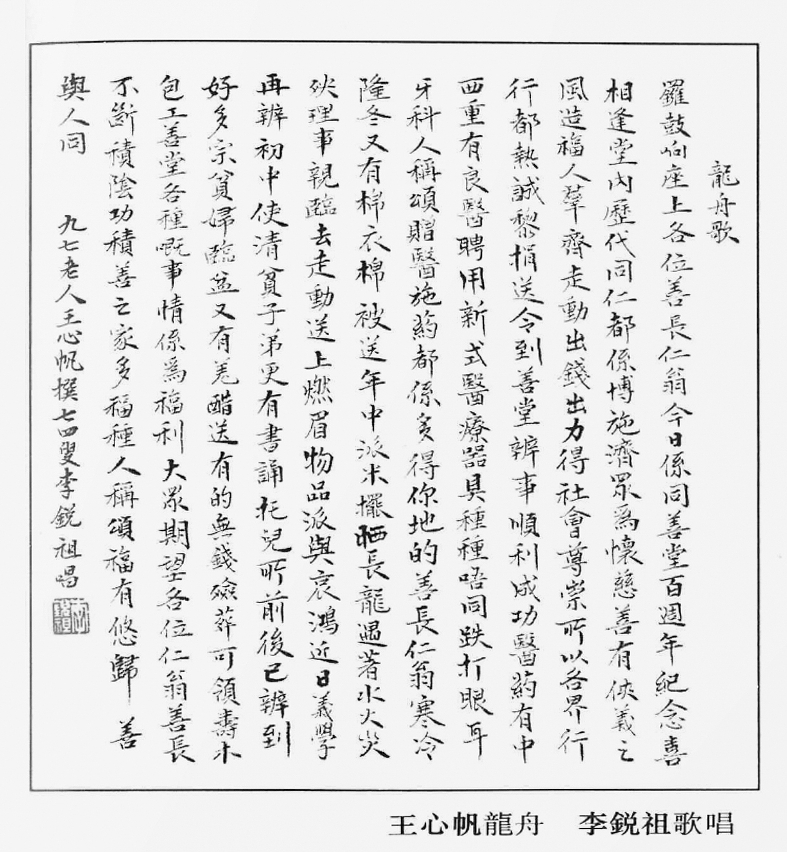 1992年,澳门同善堂成立一百周年时,97岁香港着名撰曲家王心帆为之撰写了一曲“龙舟歌”,由74岁香港着名曲艺家李锐祖说唱: