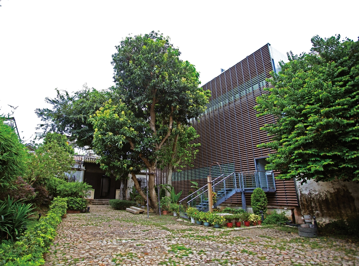 至于文昌厅花园旁边的纪念馆副楼,由于地块当时仍留存一些夯土及青砖墙体,经研究,该些遗存物可能是郑氏建筑群的一部份。在设计副楼时,除了完整地保留了墙体,新大楼的空间设计布置亦与遗址产生内在联系,使新旧空间形成连续性。副楼由于紧邻文昌厅花园,立面采用了现代的磨砂玻璃与木百叶组成的幕墙,简约的造型呼应着大屋传统的蚝壳与木百叶窗。