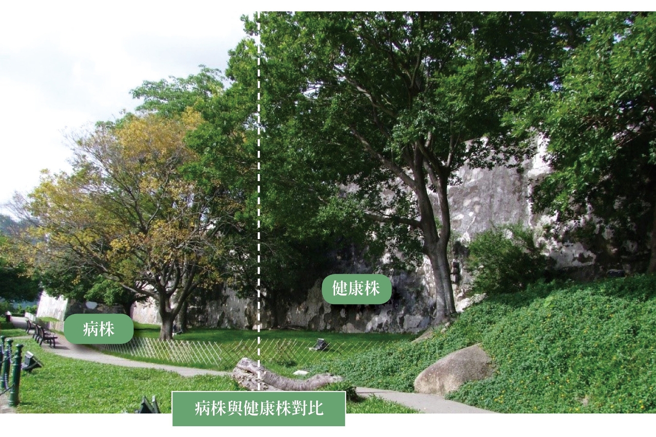 目前,树木根腐病是园林界的一大难治疾病。市政署有记录的44株死亡古树中,因天灾致死的有18株,因根腐病致死的有15株。根腐病由真菌引起,树根和树基出现腐朽,严重会导致倒塌、死亡;属土传病害,至今未有有效的防治药物和方法。