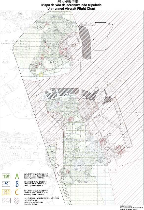 澳门现时的飞行区域可分为离地面150米的限高A区、离地面50米限高B区、离地面250米限高C区及禁飞区,根据离地面高度调整各区域范围。郑居正解释,制订此高度的依据,是以无人机的起飞点为起算点,并非离海平面的高度。「假设在高地或山顶起飞,高度便会迭加,因此部份区域的限高只有50米。」