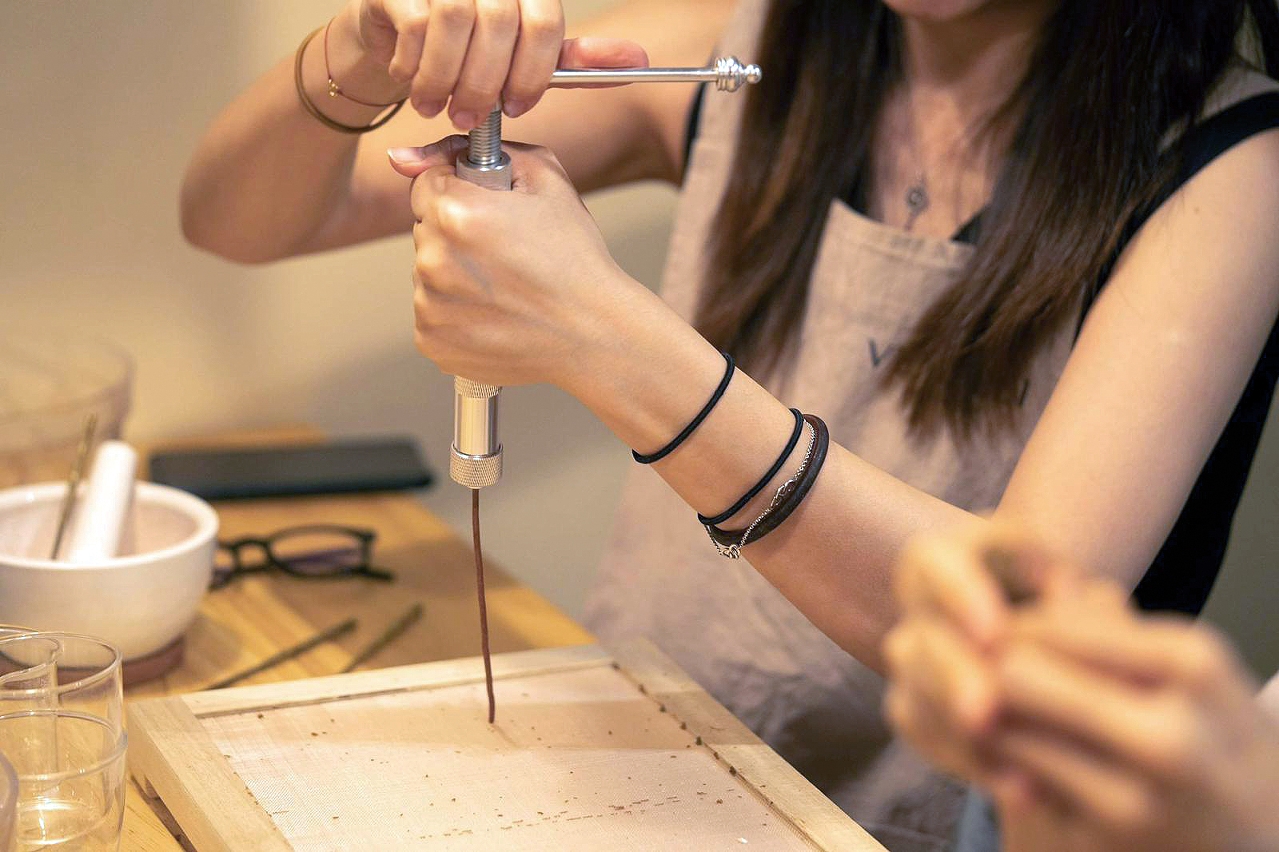 「我们的手作线香工艺虽与传统神香相近,但也有一些特点。神香不是气味合香,而是讲求速度及产量,不怕日照,能够大量生产,而且结构底部有竹签,焚烧味道很重。线香的核心重点是合香,在制作过程中须按照比例调配香料,而且须保持温度及湿度,否则会影响线香的气味。」黄竞时说。