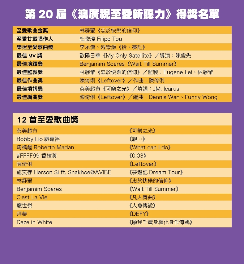 7月21日晚上,第20届《至爱新听力》颁奖礼于澳门文化中心上演,一众得奖者的忘我演出,尽显丰富多彩的澳门音乐魅力。当晚幕后功臣之一的澳广视电视制作科电视监制陈国威,分享创办节目的初心:「那时澳门电台的音乐频道,主要都是播放外地的流行歌曲,想播本地原创歌曲并不容易,因为当时每年只有个位数的出品。」为了凝聚澳门乐坛力量,澳广视内部经过连番讨论后,决定举办《至爱新听力》,以行动支持澳门音乐发展。除了公开征集澳门原创歌曲,亦邀请本地歌手参与。「在无数音乐人的努力下,参与《至爱新听力》的歌曲数量已由第一届的10首,增至今届的达百首。由此可见,澳门乐坛在过去20年间已有很大进步,亦多得这些追梦者,才能完成这场音乐盛事。」