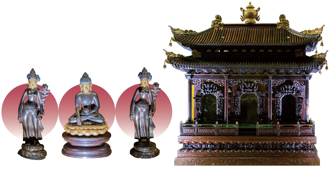 此三尊造像为一组,有清宫配做紫檀重檐楼阁式三门龛一件。结合军机处檔案及《内务府造办处活计檔》相关内容,可知这组造像是干隆四十四年(1779年)五月,六世班禅在准备进京入觐期间,于扎什伦布寺进献,由驻藏大臣索琳、留保住送入宫中。