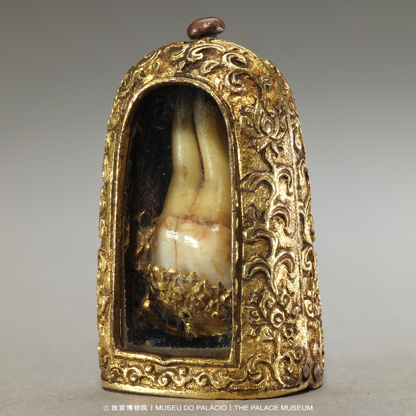 此班禅牙为臼齿一颗,牙根下嵌金属托,外配随形玻璃门铜鎏金龛。龛内附黄条:「左铜度金小仸锅一座,内供班臣额尔德尼牙。」这件班禅牙与本次展览中展出的银班禅像一起供奉于养心殿西暖阁仙楼佛堂中。这件班禅牙的来源及究竟归属几世班禅已不可详考,其金属托及随形龛为清宫后配,又供奉在干隆帝最为私密的佛堂中,这样隆重的对待可见干隆帝对这件佛教圣物的重视。