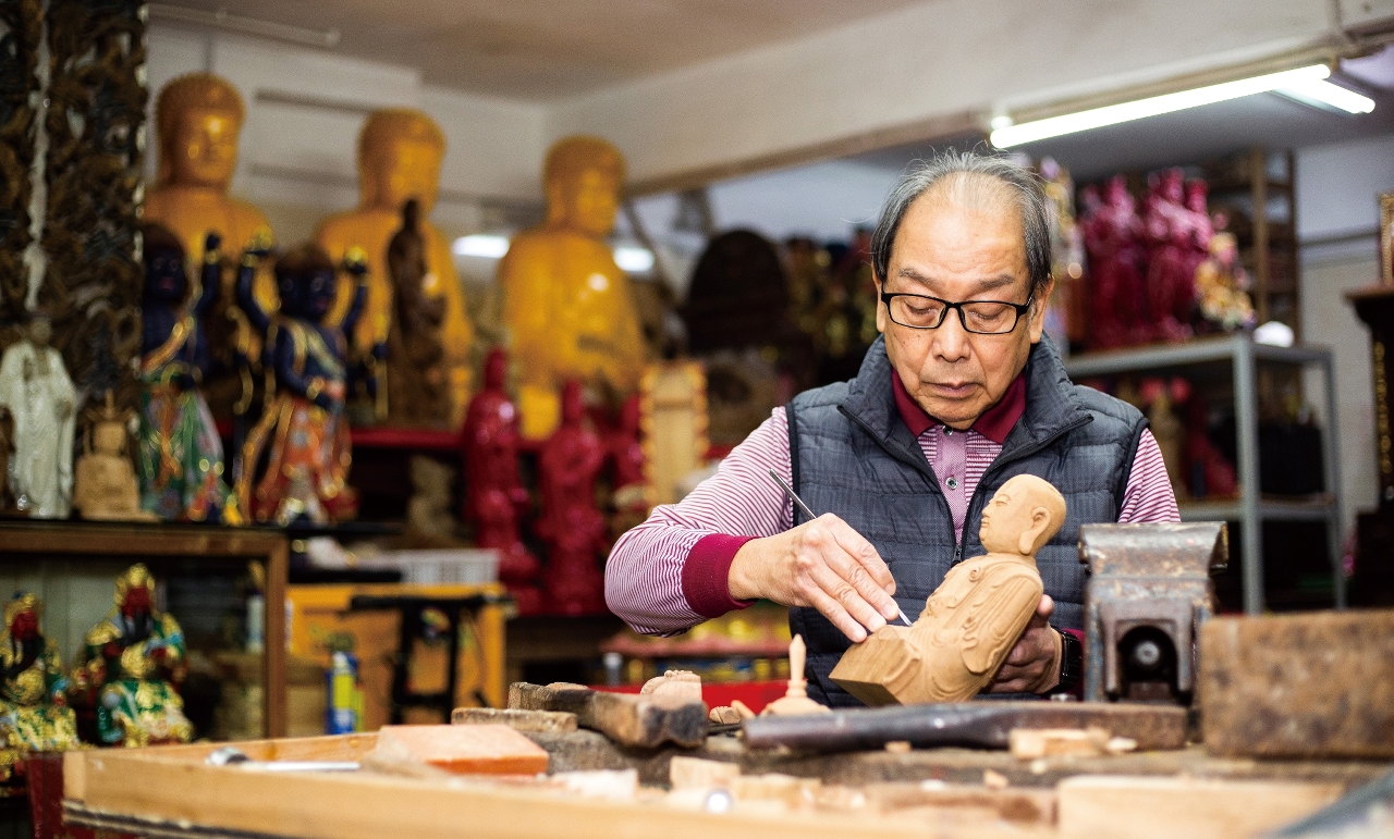 「大昌佛像雕刻木器」作为三代澳门老字号,从老一辈以制作民间信仰和神像为主,到曾德衡、曾德荣这一代,以孜孜不倦、敢于创新的思维前往不同地方学习,专心钻研,摸索转型方向,打下一片属于自己的天空。为进一步拓展业务,他们考究过不同地方的工艺,以宗教雕像为市场目标,为大大小小的庙宇提供雕像制作、修复服务。「上一代是打开门口等生意,我觉得这样有些被动,始终客源有限,于是我们便聘请师傅,主动走出去接洽。事实上,我们早期也很艰难,拿着样板奔走四方,从以前用斧头刀凿做小雕像,到用电钻、电锯做大佛,一步一步慢慢走到今天。」