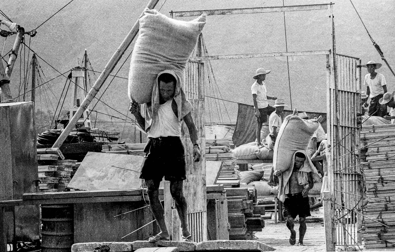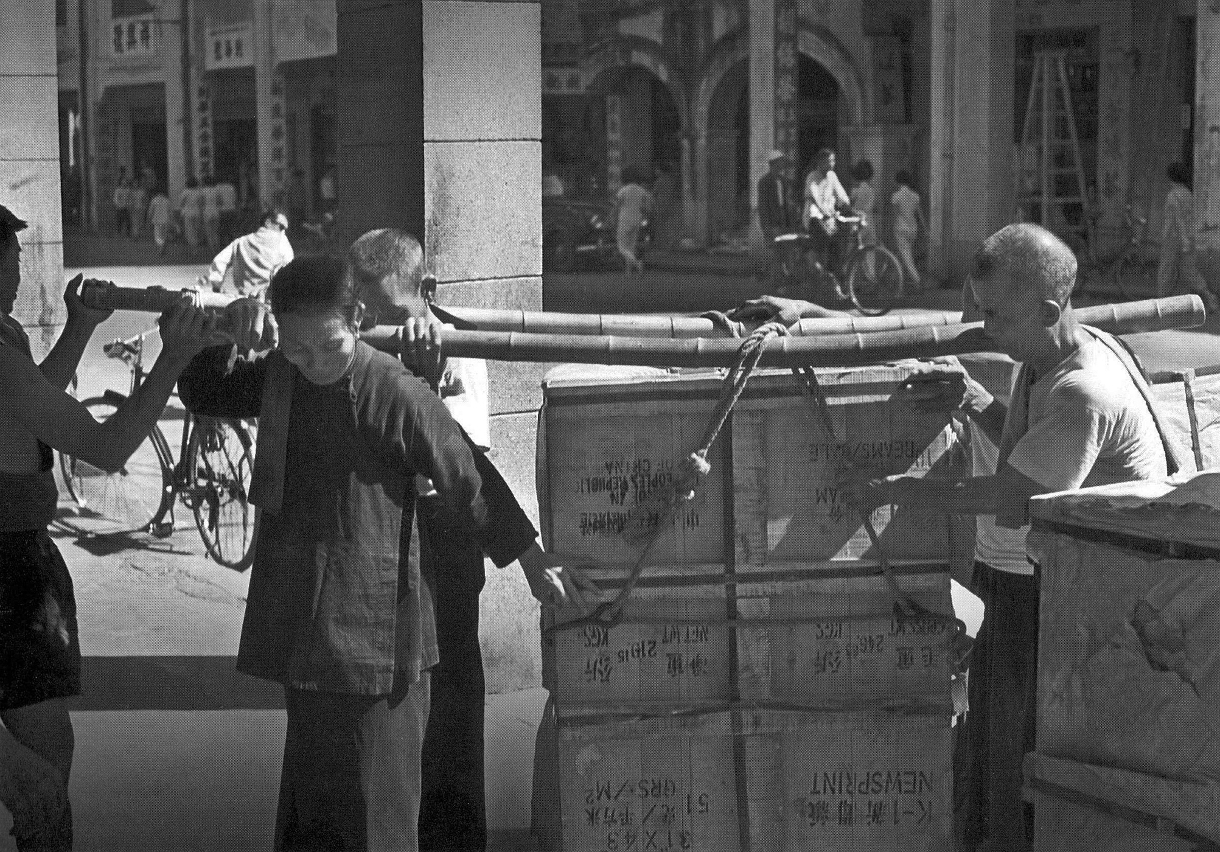 搬运工人,就是单靠出卖体力换取微薄酬劳的职业,但凡体强力健,不论男女,都可以入行,其必备的工具也很简单:一支粗如手臂的竹竿,两捆粗长的麻绳就是。