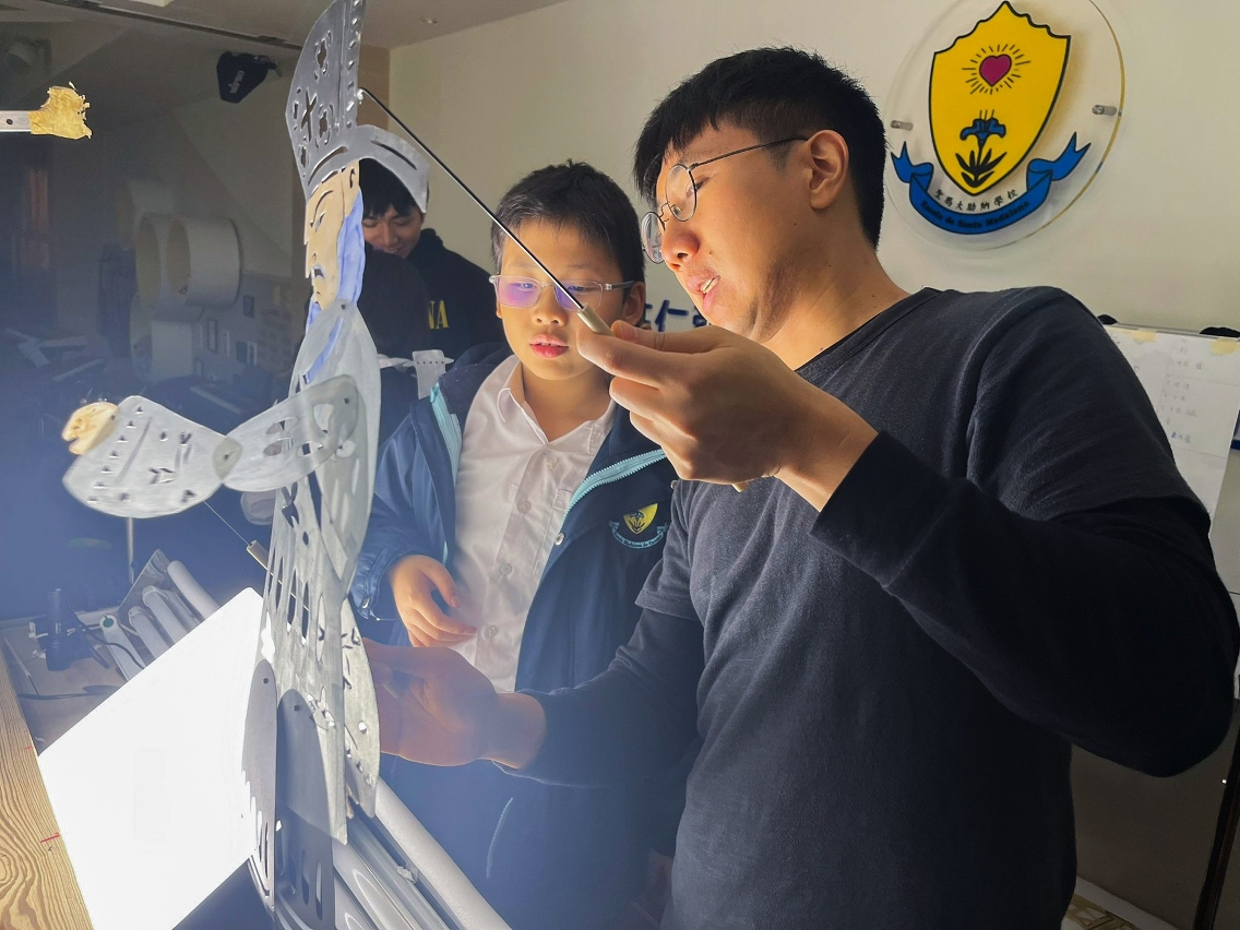 除了社区活动,郑敏琪亦于2022年把皮影戏带入她所任教的利玛窦中学,作为跨学科课堂的主题,把皮影切入到不同学科,如常识科、中文科、英文科及视觉艺术科的知识学习。「刚开始只有我一位老师,以一个星期一堂的兴趣班形式作推广。后来获得校长的支持,加上其他学科老师的协助,让皮影结合不同学科的知识,正式走进课堂。」她介绍,课程从每个学年初的10月份开始,首先利用皮影戏偶引导学生对光影的探究,自行找出适合制作皮影戏偶的透光材料,再由老师协助学生用环保物料制作皮影戏偶及戏台;在课堂的中后段,老师会带领学生利用儿童故事改编剧本,学生再翻译成英文,在翌年的2月以皮影戏形式在学校开放日中演出。