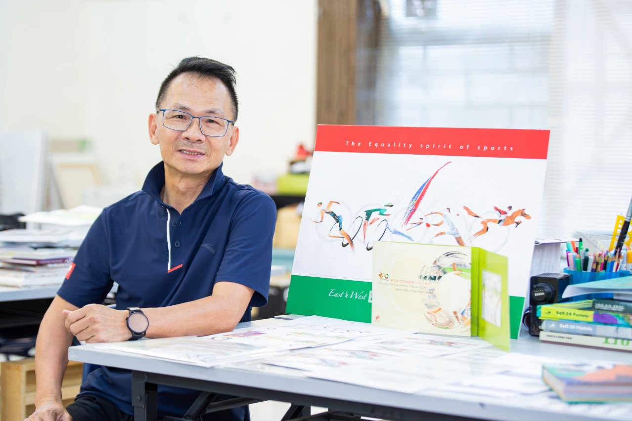 邮电局赋予设计师的创作自由,是钟渠盛尤为珍视的优势。“这种开放氛围,是澳门邮票能持续产出精品的关键。”他表示,澳门的包容性为艺术探索提供了沃土。以他设计的体育运动主题邮票为例,这是钟渠盛所钟爱的动态人体题材,也是创新实践的试验场。在东亚运动会邮票中,他将中国书法笔触化为抽象的运动线条,巧妙融入西方数码元素,营造强烈动感,形成独树一帜的视觉风格。其后,他延续这一动态风格的后续作品,荣获香港的体艺创作大赛奖项,并获东方航空公司选用,于奥运年每月航班杂志封面亮相,赢得广泛赞誉。他又以两位学生利用“Dino”IP主角创作的邮票作品为例,进一步展现澳门邮票设计的持续革新与创新活力。