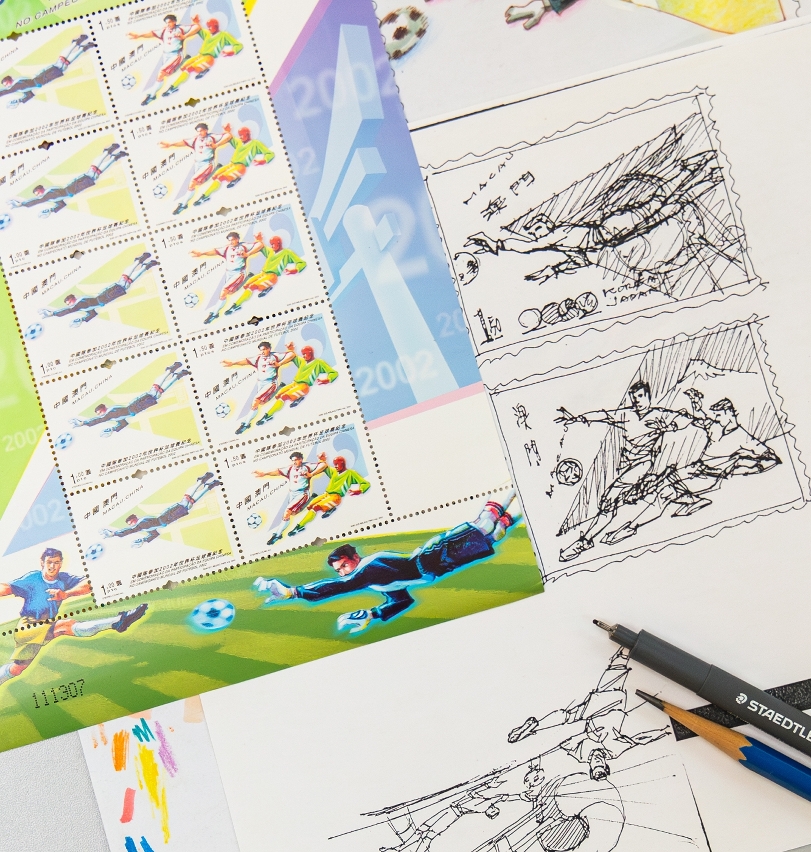 从草图到成品,邮票设计是一场精密的艺术博弈。钟渠盛坦言,因为空间上的限制,邮票当是平面设计中的一个“高难度品类”。一项创作始于与委托方的深入沟通与详尽资料搜集,接着在草图阶段反覆探索主题意念、构图、背景与故事性。“深化阶段尤为关键,需在一吋见方的空间精雕细琢,平衡视觉趣味与信息清晰度,确保构图、色彩与风格和谐统一。”他特别提到澳门邮票的独特要求:绘画风格需简练精准,文字排版清晰可辨,历史文化内涵更须分毫不差。