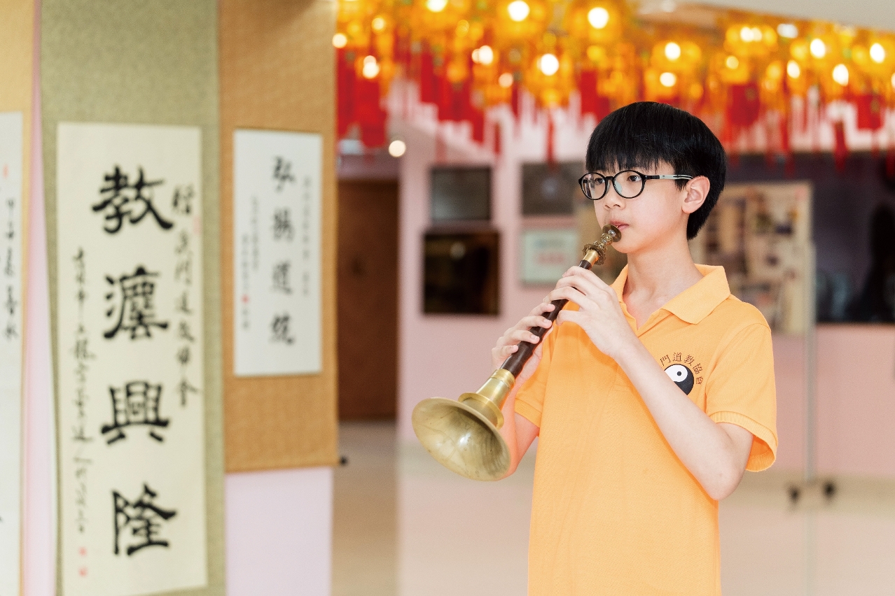 内敛的廖国曦刚放学便来到澳门道教协会会址,换上橙色的会服后,慢慢分享他加入道乐团的故事。「我今年12岁,大约两年前开始学笛子和唢吶。」他每星期都会练习3天,包括新曲学习、团练及与锣鼓合奏。「道乐讲究协作,需与锣鼓默契配合。」他坦言,与锣鼓合奏颇具挑战。
