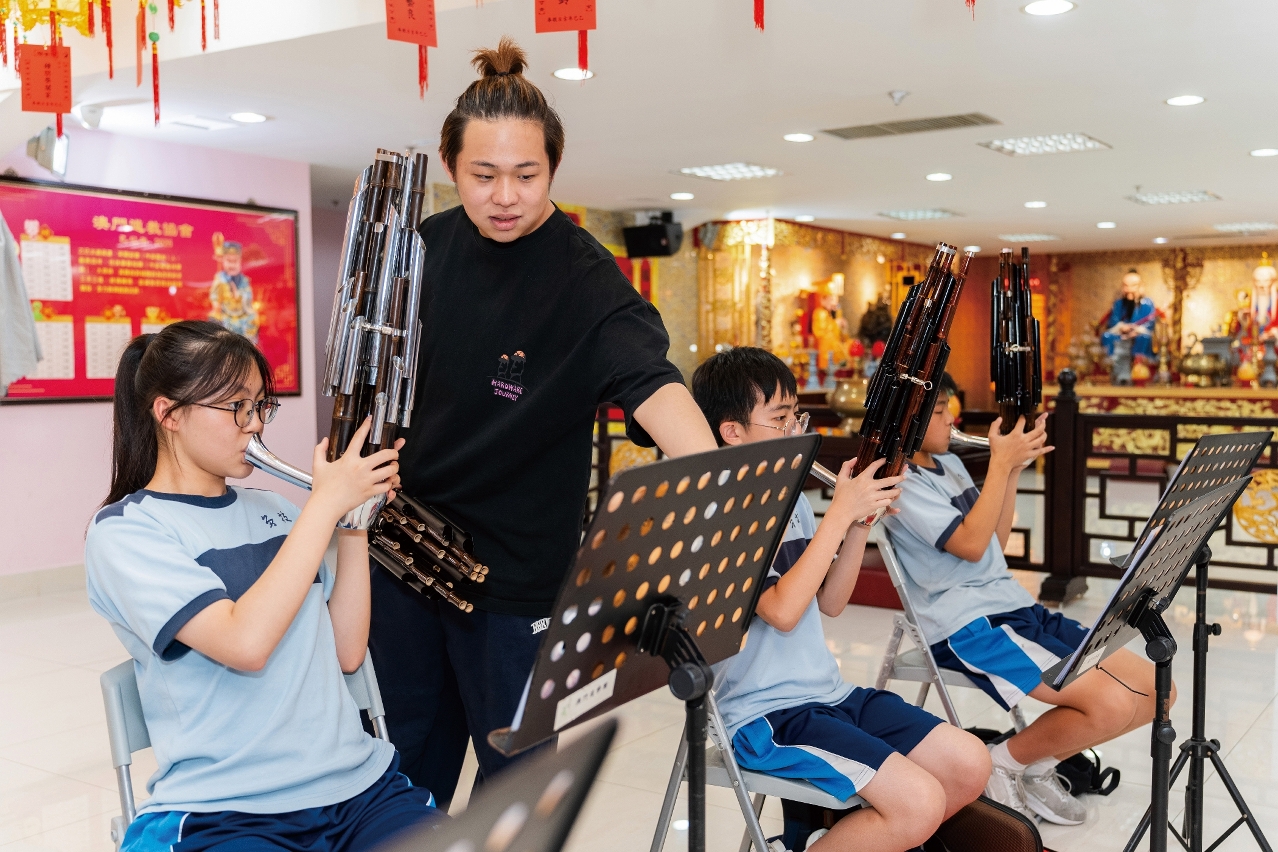 在澳门道教协会与学校合办的中乐兴趣班,吴炳鋕不时与学生交谈,鼓励他们坚持练习,未来加入道乐团。笙导师兼道乐团成员黄镇业到达协会时,吴炳鋕热情介绍,原来黄镇业很早已加入道乐团,学艺逾十年,如今顺理成章担任乐团导师。「最初因学校兴趣班爱上中乐,两年后加入道乐团。」他见证乐团日益壮大,宛如一个温暖大家庭。