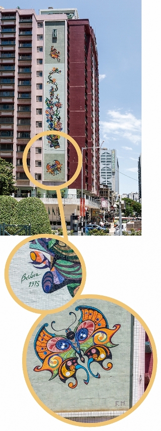 1975年,鲍博为新丽华酒店的外墙创作了另一幅巨型马赛克壁画。这幅作品以花卉为主题,采用介于具象与抽象之间的手法,花卉造型带有立体主义的影响,呈现出与葡京酒店截然不同的艺术风格。壁画旁有鲍博的签名与年份,而在底部蝴蝶图案下方,还可见「F.M」的签名,暗示可能有另一位创作者参与,但究竟是谁?仍有待研究。