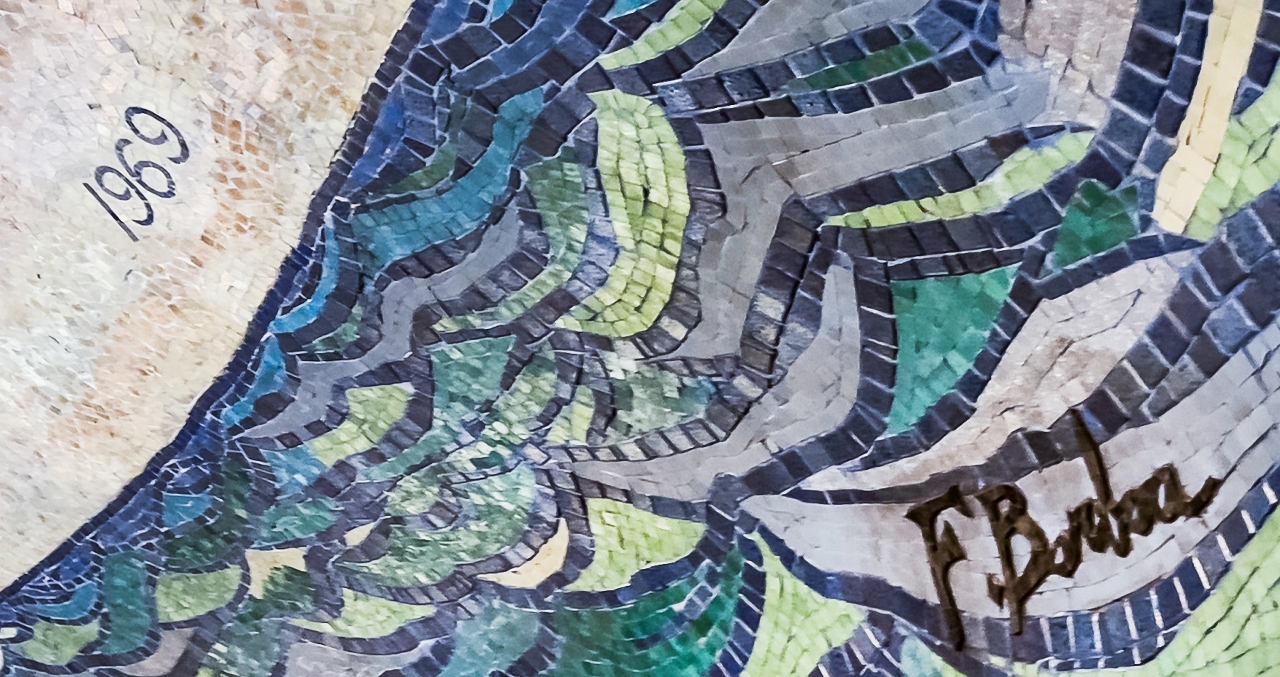 在壁画一角,一个不太显眼的签名与年份「F. Borboa 1969」揭示了创作者的身份。这位艺术家便是鲍博,一位鲜为人知的墨西哥裔马赛克艺术家。