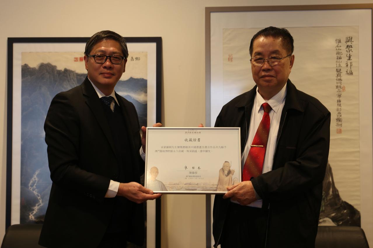 谢舸伉俪,文化界知名人士黎鹰、梁晚年、吴利勋、吴仕明、刘富业、赵维富、郑枫林、关权昌、李英维等参加颁发证书仪式。嘉宾赞扬谢舸的捐出珍藏创作值得效法,并认同艺博馆重视及收藏澳门艺术家具代表性的作品。