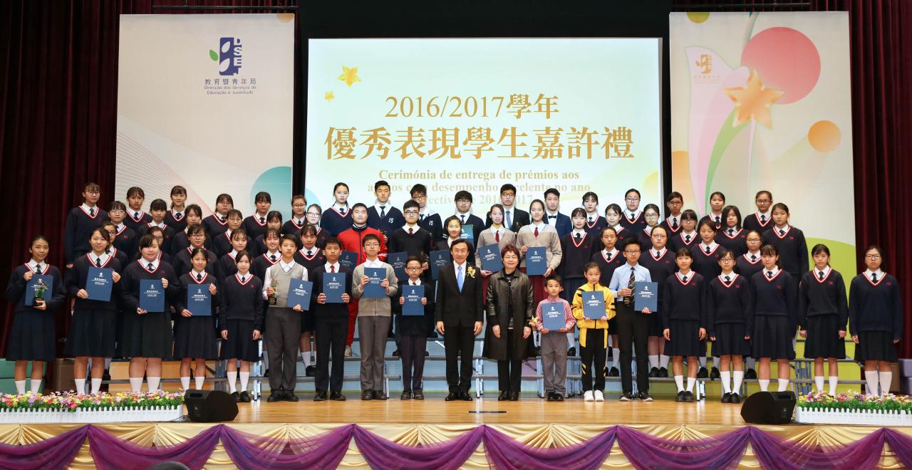 获得2016/2017学年“优秀表现学生”荣誉的4名获嘉许学生及6个团队分别是田迦浚、林思庄、黄心妍、黄脍先,以及培正中学代表队、圣公会(澳门)蔡高中学合唱团、慈幼中学代表队、濠江中学附属小学代表队、镜平学校代表队和由澳门国际学校、澳门葡文学校及鲍思高粤华小学 (中文部) 学生组成的Macau Cello Trio。有关学生在创新发明、数学、科学、体育、艺术等方面,发挥优异水准,屡获佳绩。