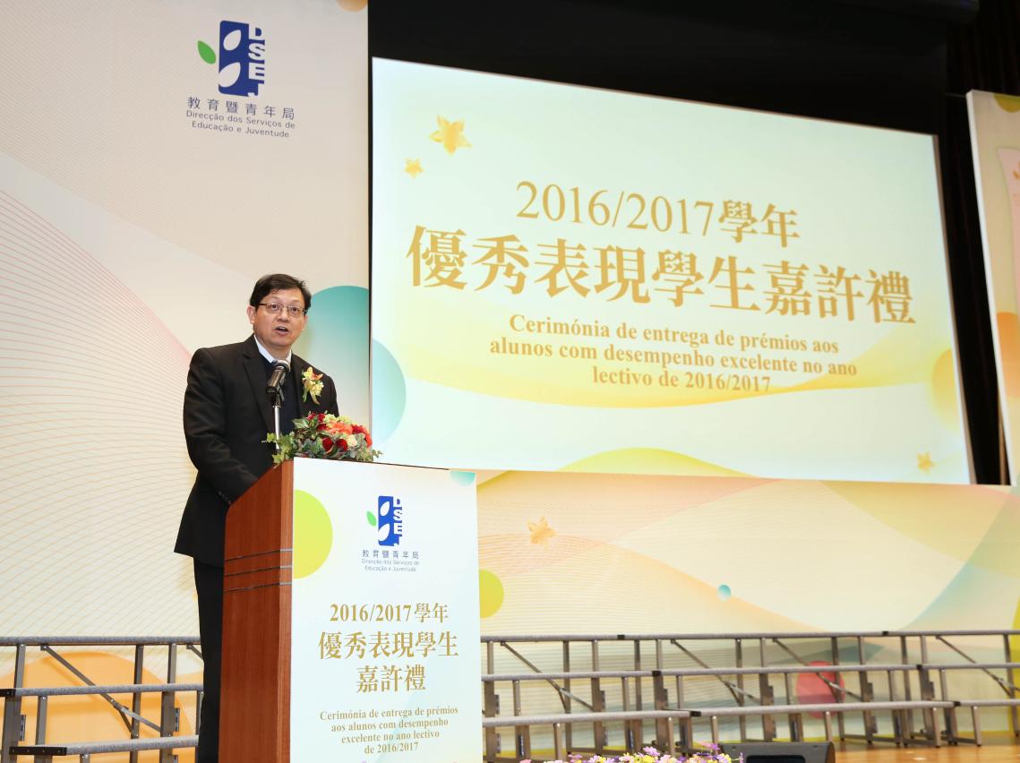老柏生致辞时表示,学生表现杰出,并取得优异成绩,是教育界共同努力的成果,期望有关学生继续努力,再接再厉,精益求精,日后在各个专长领域发挥所长,服务澳门社会。教青局将一如既往,落实《非高等教育发展十年规划》的目标和方向,创造更好的教育条件,发展优质教育。
