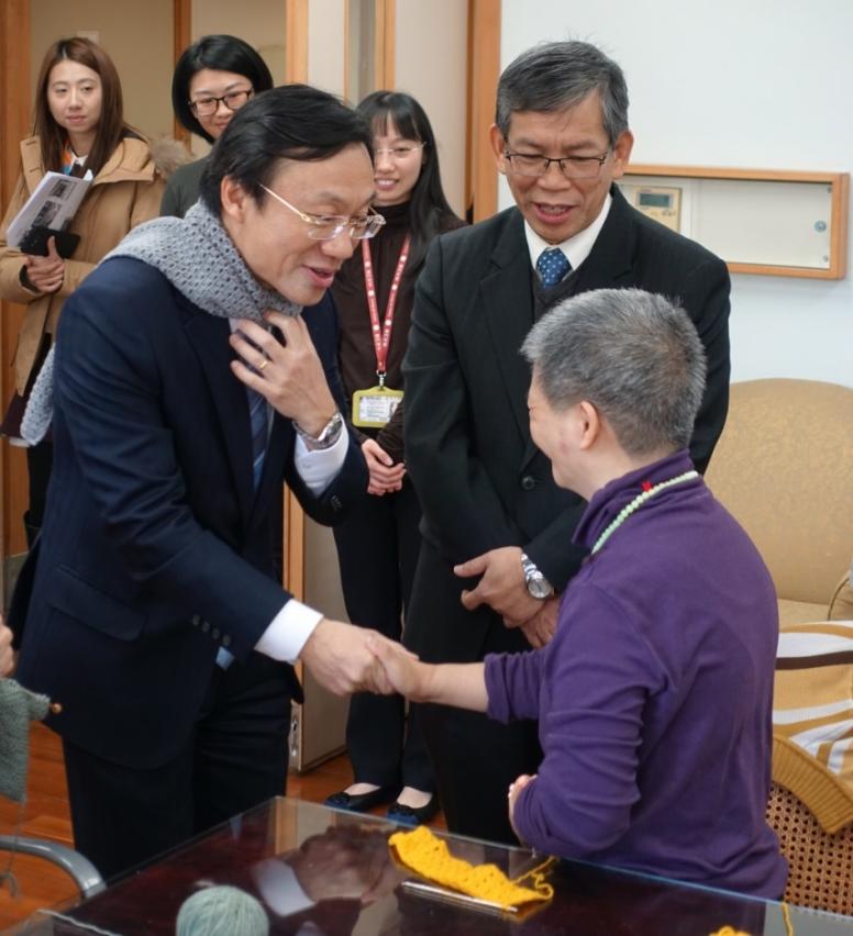 谭俊荣参观了各间院舍的房间、治疗室、活动室等,了解院友的起居生活和康复训练情况;又观看了院友烘焙饼干、绘画、劳作、表演太极扇、编织、收割农作物等情况,了解院友的多元技能和艺术才华。期间,院友向谭司长致送亲手制作的纪念品,谭司长并立即戴上院友送赠的手织颈巾,场面十分温馨。