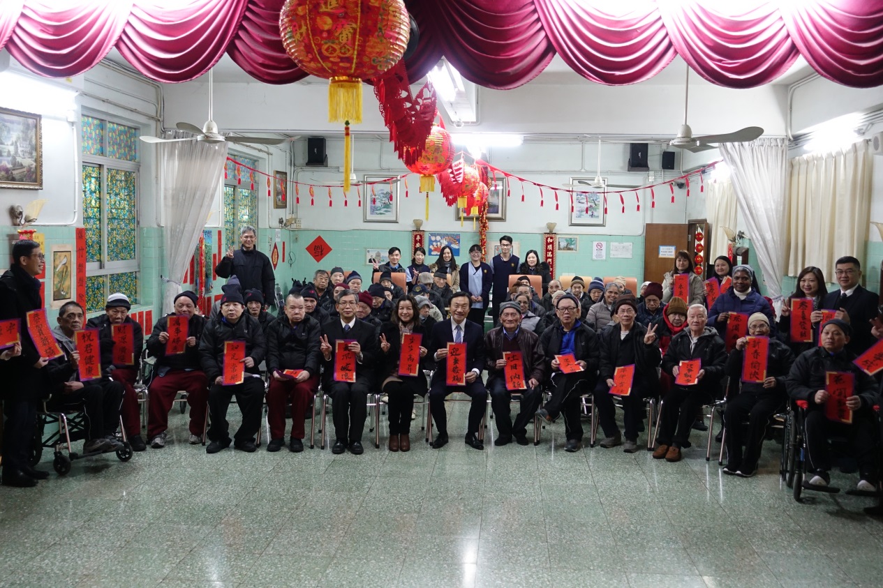 藉新春佳节将至,谭俊荣祝贺院友新年快乐、事事顺利,又分别与各间院舍的院友合唱《祝福你》、《欢乐年年》、《迎春花》多首贺年歌曲,并向院友送赠果篮,表达春节问候。