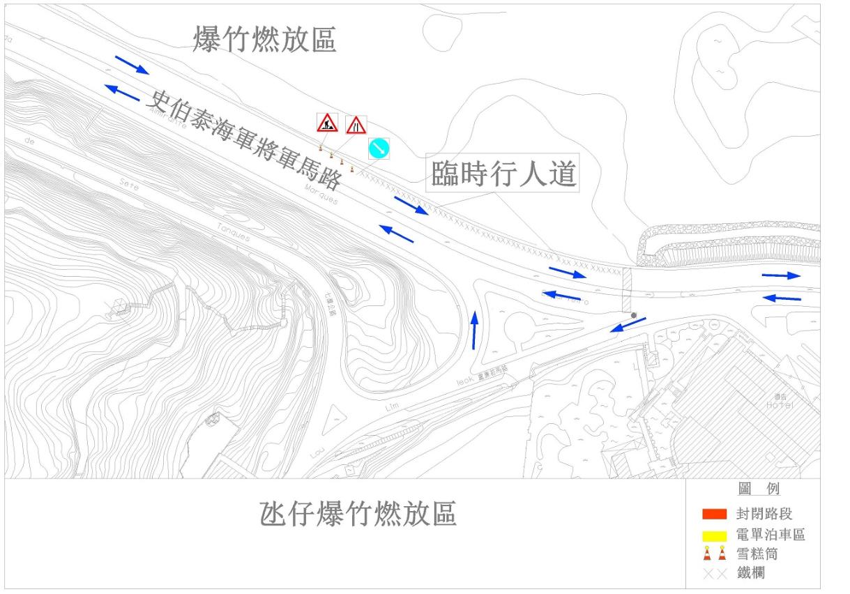 配合民政总署设置爆竹烟花燃放区及销毁爆竹,由2月14日(年廿九)至2月21日(年初六),孙逸仙大马路、观光塔街及氹仔史伯泰海军将军马路实施临时交通安排(详见附表)。