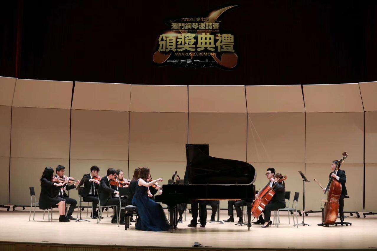 澳门理工学院艺术高等学校音乐课程表演专业四年级学生谢欣,在上周刚结束的“2018第七届澳门钢琴邀请赛”中,凭着出色的发挥,在众多参赛选手中脱颖而出,勇夺“专业青年组金奖”,指导老师是理工艺校音乐课程郭家豪博士。在比赛的颁奖典礼上,谢欣更获邀与曾获颁大英帝国勋章的着名英国指挥家Nicholas Michael Smith及其带领的澳门精英青年乐团,假澳门大学合作演出浪漫派法国作曲家圣桑(Camille Saint-Saëns)的降A大调随想圆舞曲,作品76,备受场上嘉宾和观众报以热烈的掌声及好评。