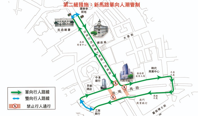 当第一级措施未能解决人群持续挤拥问题时,在第一级的基础上,新马路将实施单向人潮管制。行人需遵照附图所示‘倒T’字体单向行进路线前往议事亭前地、大西洋银行、汇丰银行、商业银行、工商银行、中国银行及民政总署等地点。