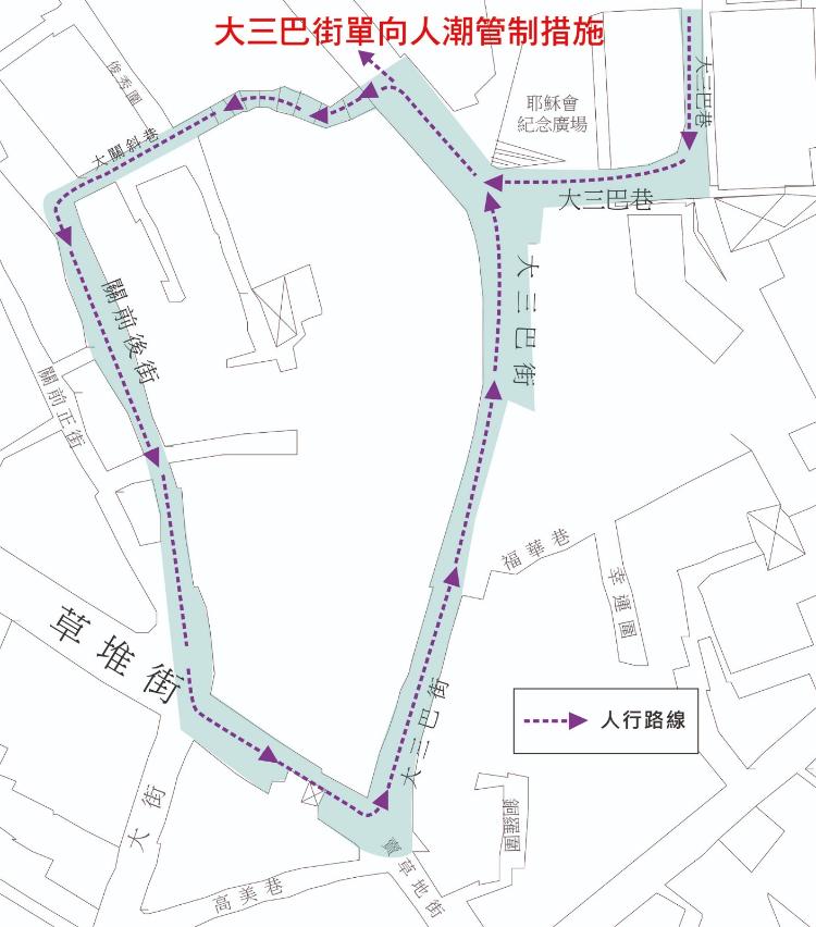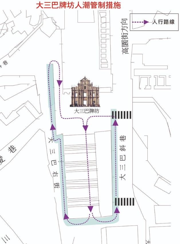 当大三巴街(手信街)人群出现挤拥时,将会实施单向人潮管制措施,人流只可单向上行往牌坊,并取道周边的街巷如大关斜巷、关前后街、高园街等离开。