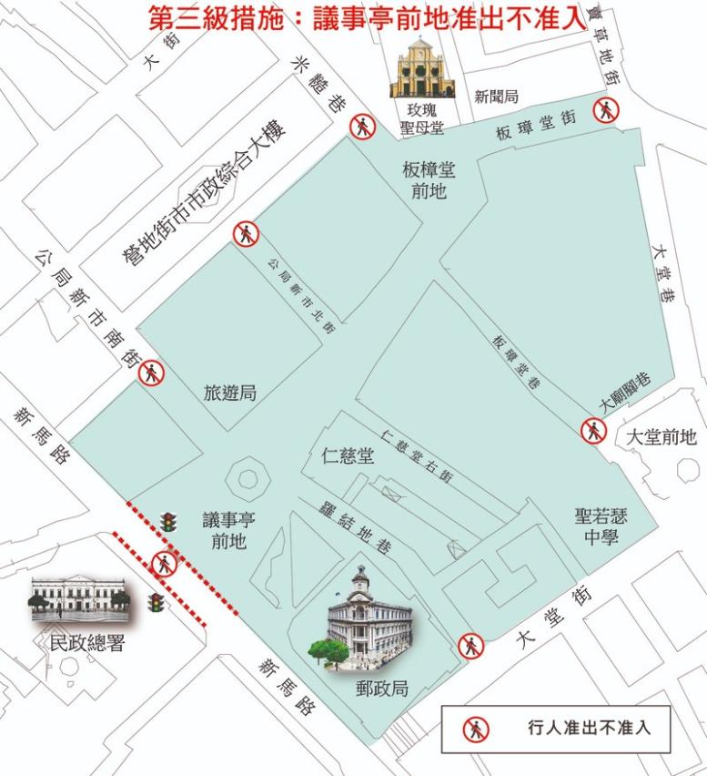 当新马路及议事亭前地人群出现大范围挤拥时,在第二级的基础上,议事亭前地至玫瑰堂整片区域将会视乎实际情况采取局部或全部封闭,届时在区域内的人群可以离开,区域外的人士不可内进。