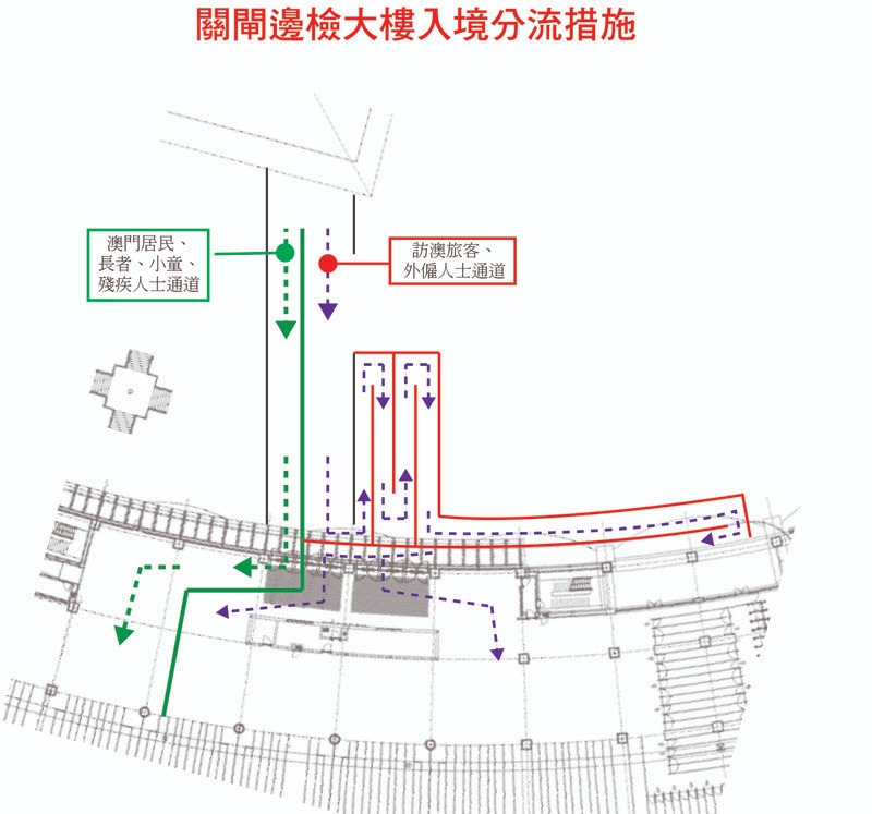 当离境大堂接近饱和时,关闸广场风雨廊路段,会实施“分流及分段放行”的措施,临时封闭该走廊两边,在特定位置设立出入口。澳门居民、六十五岁或以上长者、孕妇、伤残人士和三岁及以下小童,将被安排使用其中一条专用队列,而其余旅客包括外雇人士则使用另一队列。