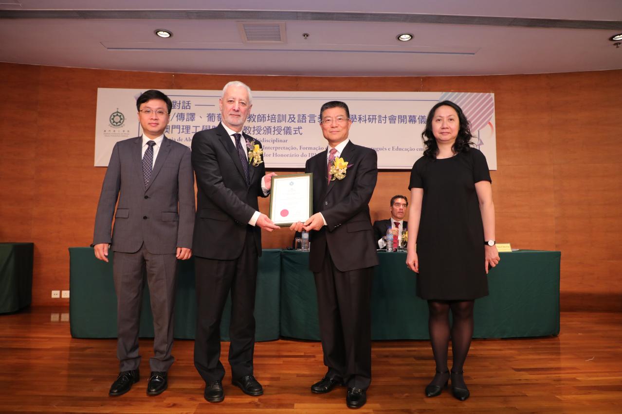 理工学院“‘当代对话’- 翻译及传译,语言教育与葡语教师培训多学科学术研讨会开幕仪式暨澳门理工学院名誉教授颁授仪式”四月二十三日上午在该院汇智楼演讲厅隆重举行,由中联办教育与青年工作部处长洪波、高等教育辅助办公室主任苏朝晖、葡萄牙驻澳门及香港总领事薛雷诺、葡萄牙驻联合国教科文组织常设代表沈帕奥(António Sampaio da Nóvoa)、理工学院院长李向玉主礼,来自葡萄牙多所着名大学及本澳大学的专家学者,以及理工师生约二百人出席。葡萄牙驻联合国教科文组织常设代表及葡萄牙里斯本大学名誉校长沈帕奥获澳门理工学院颁授名誉教授衔。