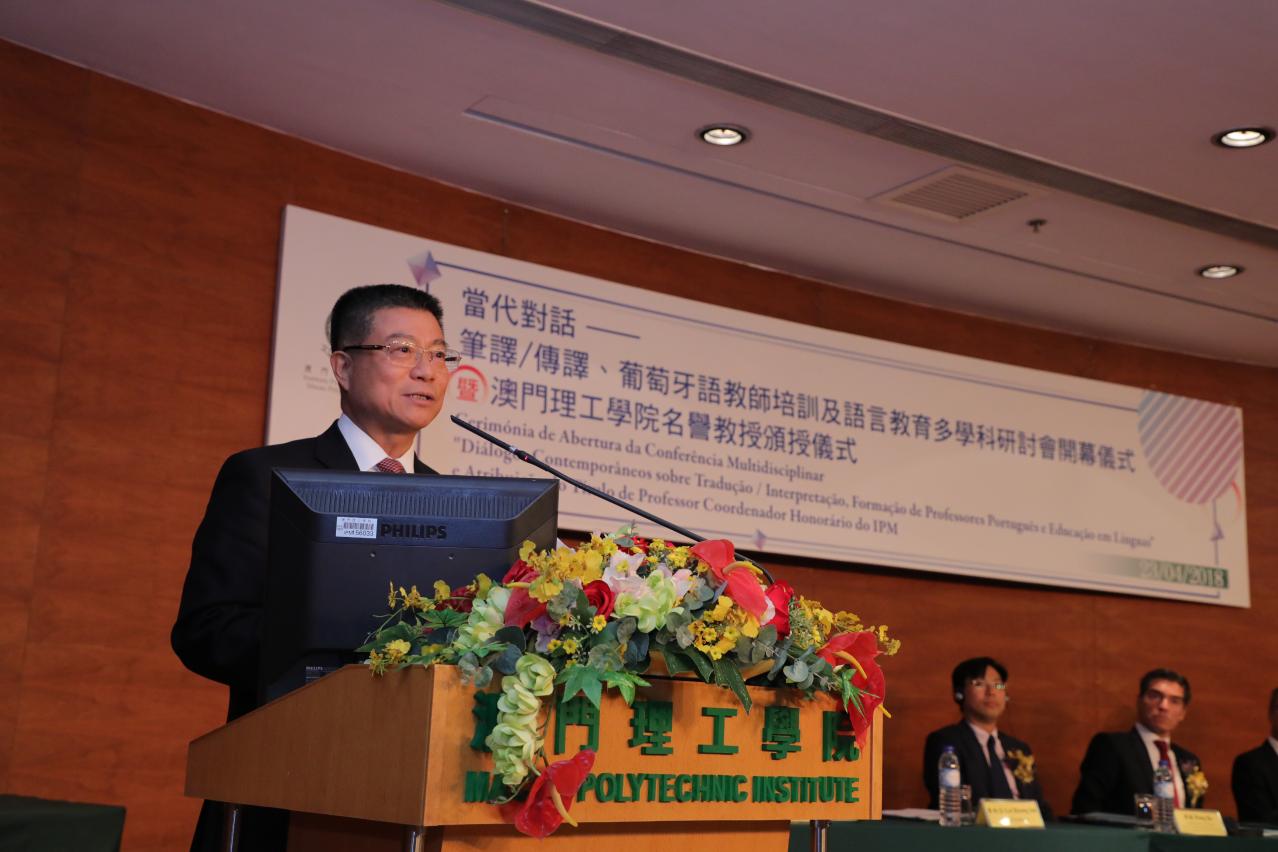 李向玉致研讨会开幕辞时表示,理工学院多年前便坚持推动语言教学,尤其将保证持续、优质的葡语教学水平确定为战略发展重点。远在澳门作为中国和葡语国家平台这个概念兴起之前,已身先力行,促成并贯彻这一理念,努力的成果有目共睹,作为一所高等教育机构,师资、学生、课程、科研都是累累硕果,多年来培养了一批又一批的毕业生,教学质量得到了国内和国际认可。在加强办好葡语相关专业的多个学位课程,还与中国、葡萄牙及葡语系国家高校展开了丰富多样的合作。随着新高等教育法的实施,理工新学年将推出实力雄厚的师资阵容,负责上述领域硕士及博士课程的教学任务。本次研讨会旨在促进教学和科研,更与理工学院的基本宗旨密切相关,透过“当代对话”,专家学者围绕葡语教师培训、语言教学以及一切与笔译及传译教学、科研相关的议题进行广泛讨论,呈现科研和教学成果,理工学院诚挚感谢所有与会者的参与。李向玉接着表示,值这次研讨会为契机举办颁授荣衔仪式,请来了里斯本大学名誉校长、葡萄牙驻联合国教科文组织大使沈帕奥(António Sampaio da Nóvoa)教授,这位教育学多个领域的专家,成就斐然、享誉世界的大家鸿儒,也是公民典范,理工学院授予其荣誉教授头衔,其名将列入理工学院名师名册,有着特殊的含义和意义。