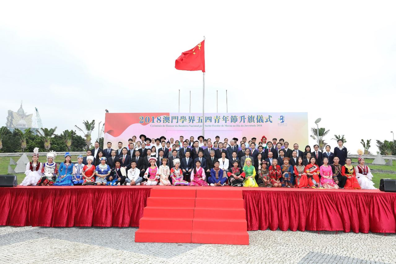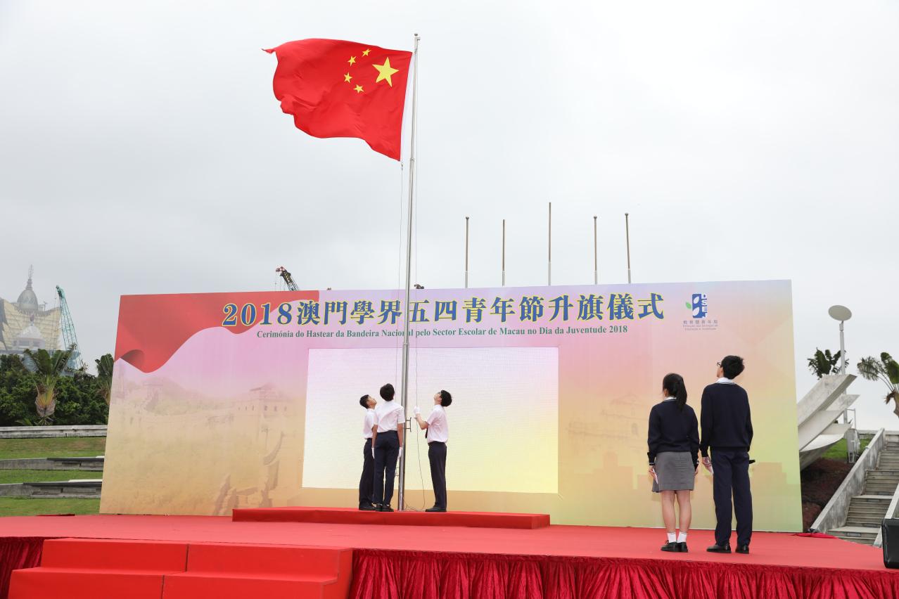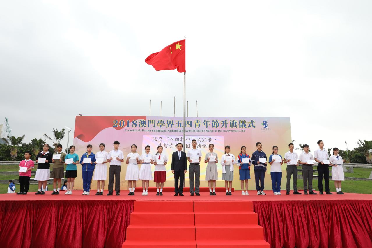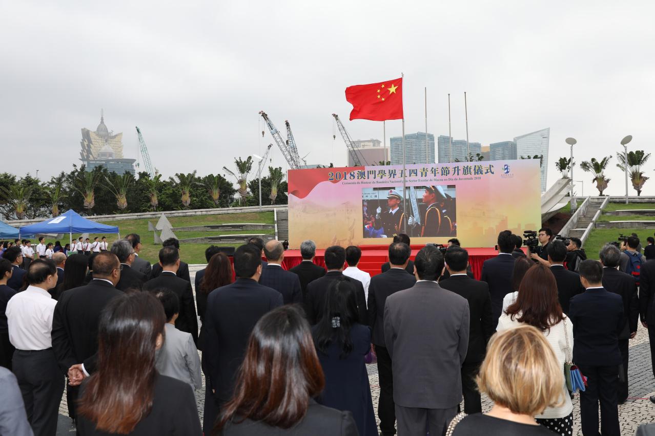 为推动爱国爱澳教育,加强学生对五四运动精神和历史的认识,教育暨青年局于5月4日早上在西湾湖广场举行“澳门学界五四青年节升旗仪式"。中央人民政府驻澳门特别行政区联络办公室主任郑晓松、社会文化司司长谭俊荣、社会文化司司长办公室主任叶炳权、教青局局长老柏生、中央人民政府驻澳门特别行政区联络办公室教育与青年工作部部长徐婷、中华人民共和国国家民族事务委员会港澳台办公室副主任兰海滨、中华人民共和国外交部驻澳门特别行政区特派员公署公共外交和新闻部主任郑新友、教青局各部门主管、非高等教育委员会委员、青年事务委员会委员、教学人员专业委员会委员,以及70多所学校和20多个青年社团的代表,共超过1,700人出席。