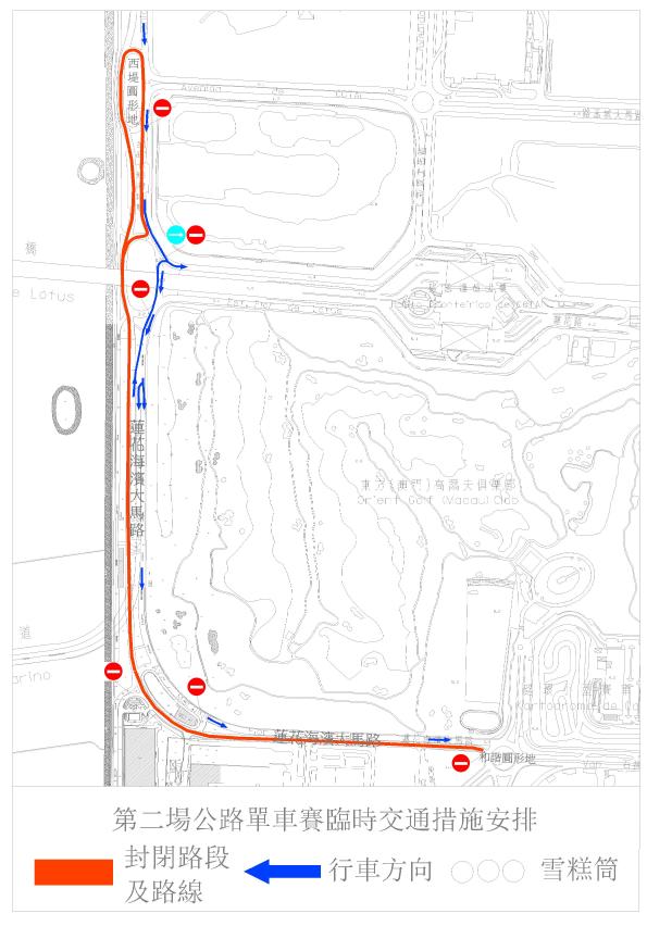 介乎西堤圆形地与和谐圆形地之间的一段莲花海滨大马路靠海一侧车行道,即由和谐圆形地往奥林匹克游泳馆圆形地方向禁止车辆通行 |
