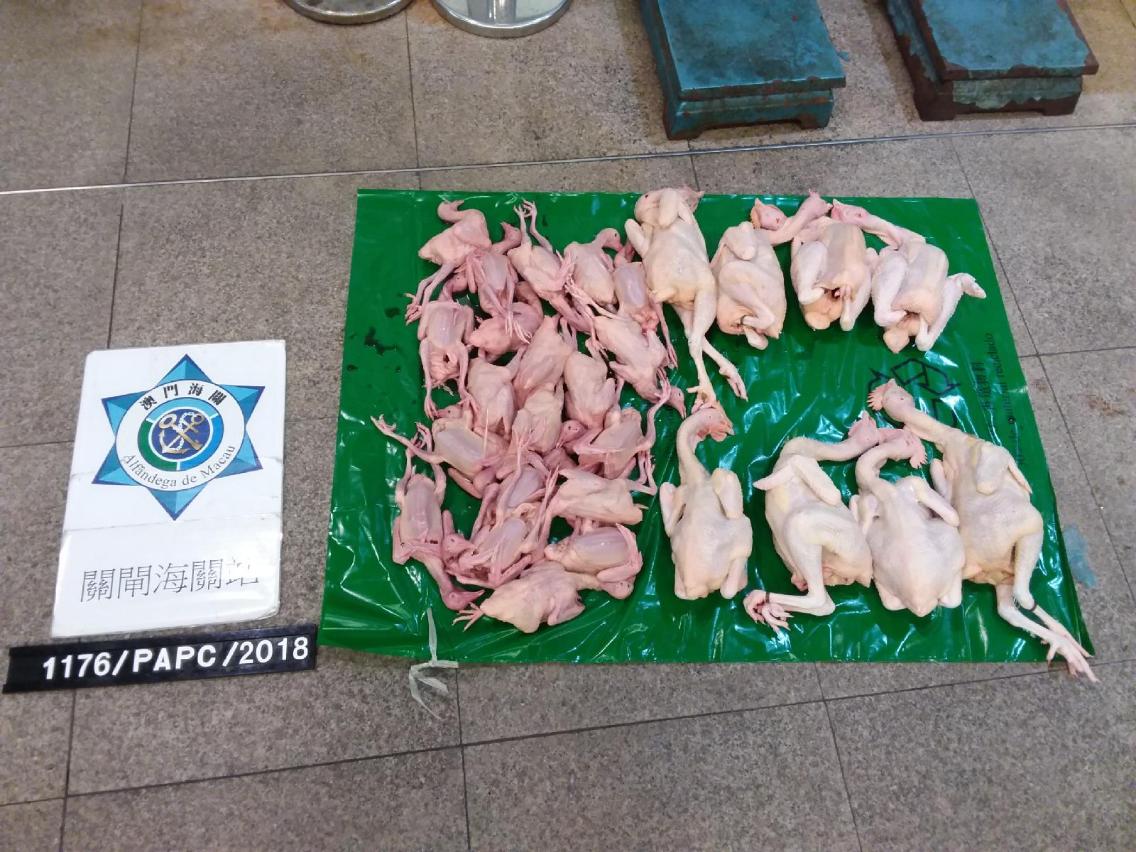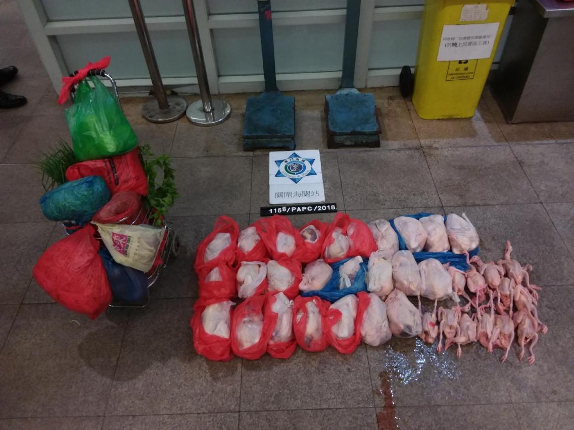 另外,于本月12日,关闸口岸亦查获一名本澳女子,以手拖车运载已宰鸡只36公斤及乳鸽5公斤入境,被关员截获。经翻查纪录,违法者曾有前科,于今年3月31日因携带14公斤鸡肉入境而被起诉。