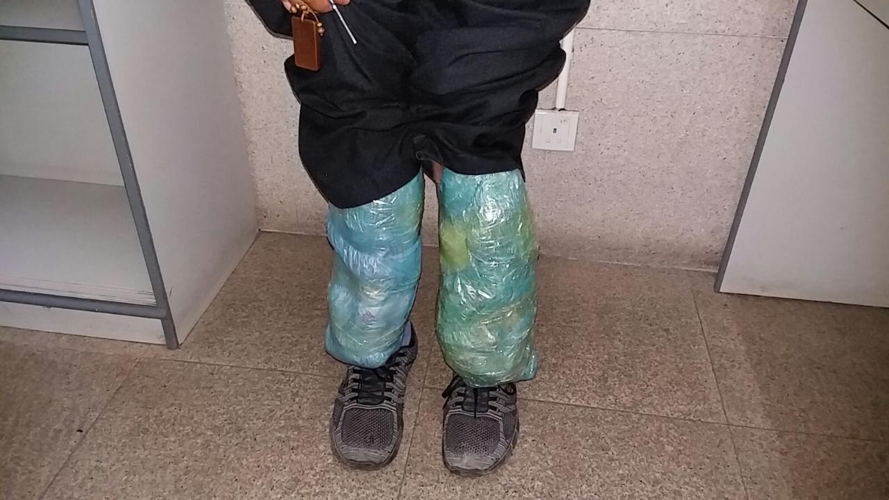 本月14日,一名本澳男子经关闸口岸进入澳门时,关员发现其行动异常,穿着的长裤十分宽阔,形状不自然,遂向其示意受检。经检查发现其双腿上捆绑了共重7公斤之已宰乳鸽,另外,在其携带的行李中发现一批新鲜鸡肉,合共11公斤,上述物品均未经申报及检疫。