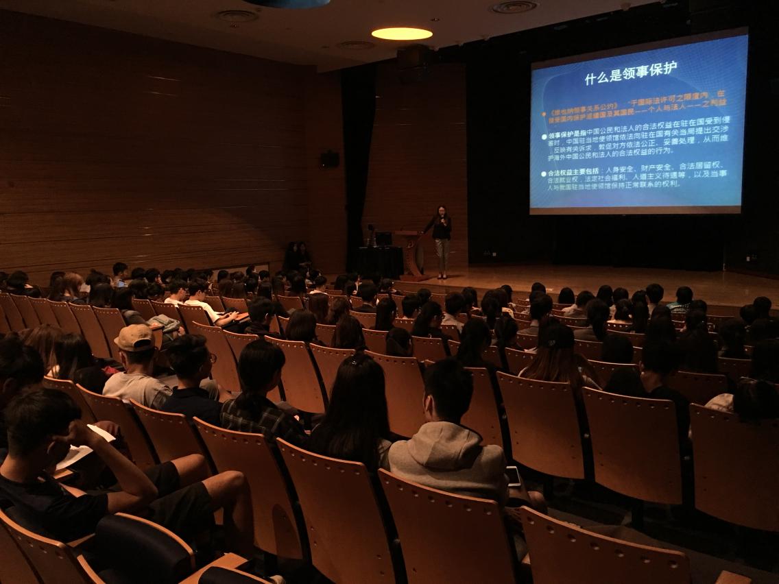 讲座中,刘玉飞主任介绍了我国外交部领事司在领事保护与领事服务的主要工作,以及驻外国领事馆如何协助中国公民解决在国外遇到各种不同的事故和问题,如何保护中国公民在国外的合法权益;同时也提醒学生身在外地时必须遵守当地法律,尊重当地宗教礼节和文化等。她分享了多年驻外国领事馆的工作,依法保障中国公民安全的案例;此外,她还介绍了当某些国家发生自然灾害或局势动荡时,我国外交部曾多次起动了大规模撤离当地中国公民和华侨的紧急措施,在国际上赢得了高度的赞赏,体现出国家的国力越来越强大,以及在国际上突出大国外交的力量。她以通俗易懂的方式,详细讲解了领事保护知识,呼吁学生们在国外时需防范各类安全风险和提高防范意识,并向学生们推介了外交部全球领事保护与服务应急呼叫中心及热线电话。