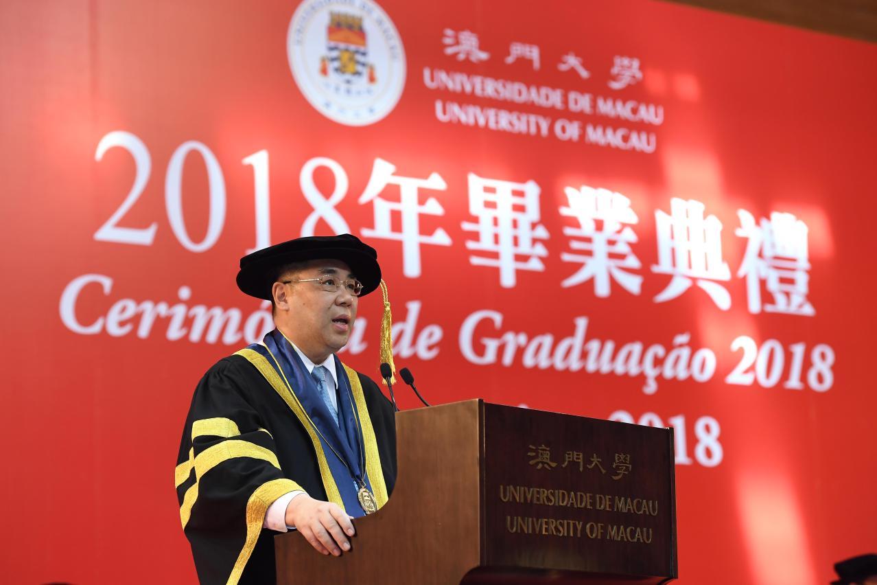 宋永华致辞时表示,澳大经过37年的发展,已形成以专业、通识、研习及社群教育为主的全人教育模式,创建了学院与书院相辅相成的协同育人体系。其中住宿式书院系统更是澳大本科生教育的最大特色,是美国教育家约翰˙杜威 (John Dewey) 提出“教育即生活、生活即教育”理念的澳大实践。他深信学生四年来在书院生活过的所有痕迹都不会消失,会潜移默化地为学生的未来带来积极的影响,这正是澳大创建住宿式书院的核心价值。他还勉励学生牢记校训,志存高远,积极发挥自身所长,用创新成就梦想,用毅力达成目标,勇于尝试,敢闯新路,为澳门、为袓国以至全球的发展注入更多新思维新动力。