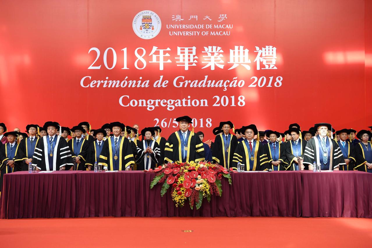崔世安在澳大校董会主席林金城、校长宋永华,副校长倪明选、马许愿、高薇等陪同下主持典礼。大学议庭成员、校董会成员、教务委员会成员、政府官员、社会贤达、家长及教职员等近4千人出席见证。
