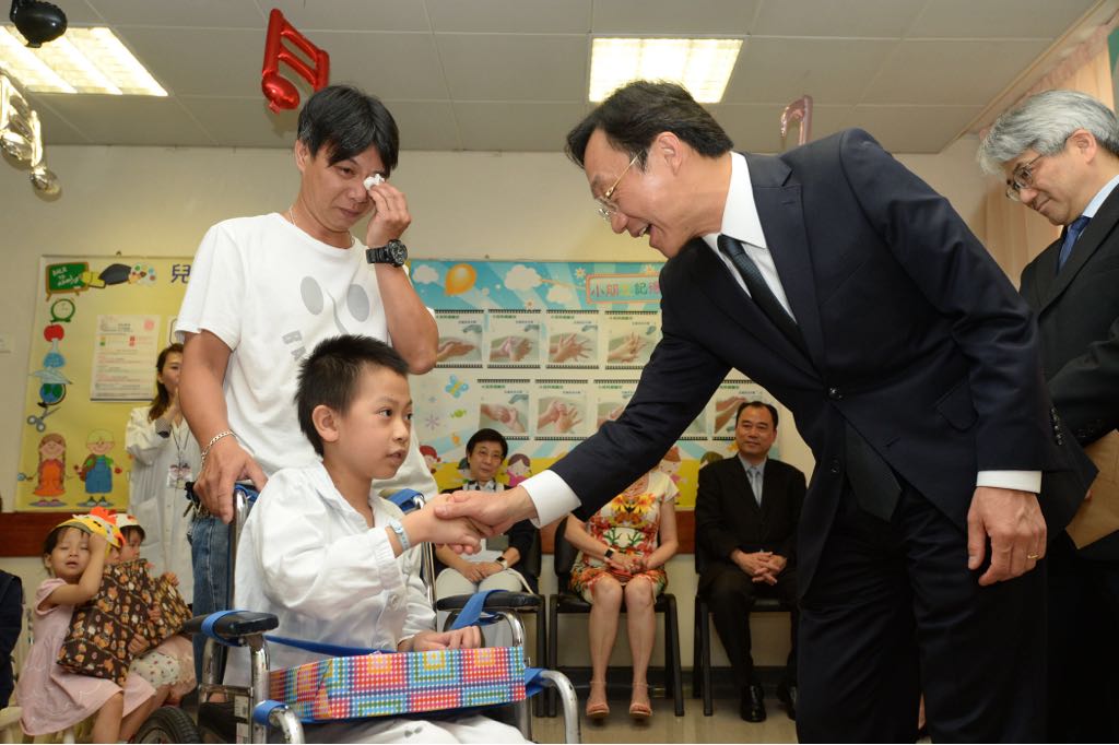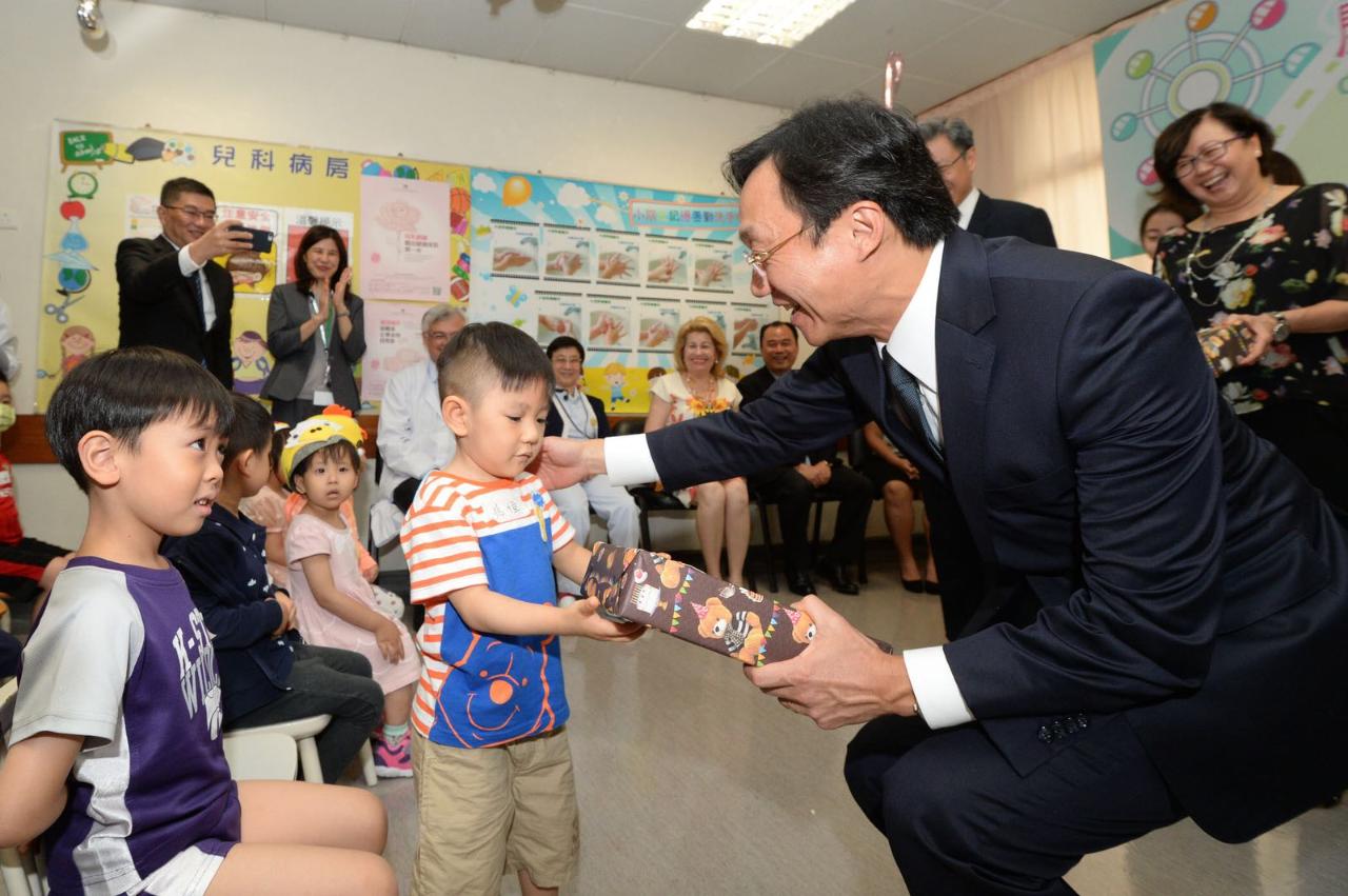 谭俊荣司长及一众嘉宾亲切慰问住院儿童,送上节日祝福,并勉励他们勇敢、坚强地面对疾病,早日康复;此外,亦参与了由澳门义务青年会及仁伯爵综合医院工作人员为该院儿童举行的联欢会,并派发由母亲会赞助约280份的儿童节礼物,期望儿童在医护人员的悉心照料下,可以早日出院,健康成长。期间,有住院儿童在家长的陪伴下,分别向卫生局李展润局长及教育暨青年局老栢生局长送上感谢卡,答谢不同政府部门对住院儿童的照顾及关怀。
