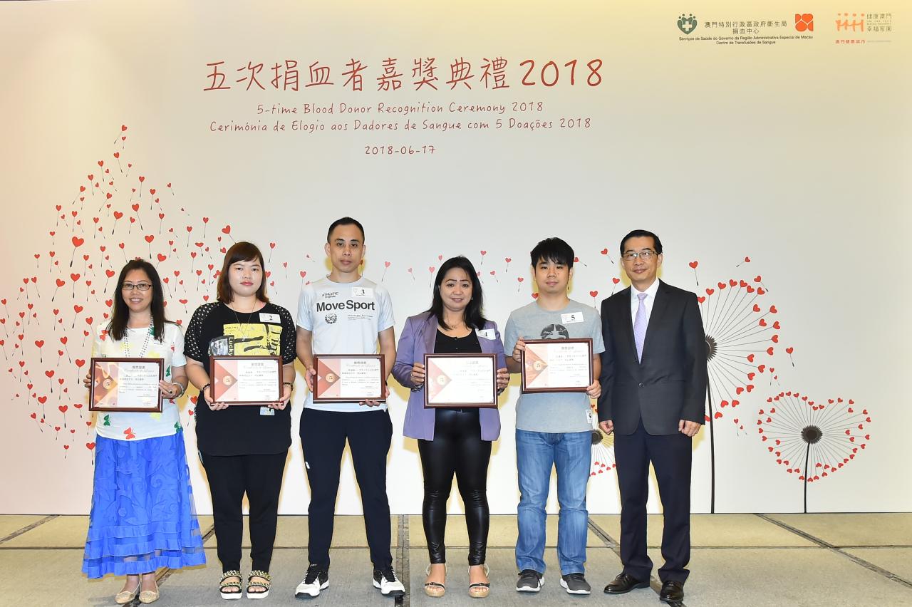 卫生局捐血中心今日(6月17日)举行了2018年“世界捐血者日”系列活动“五次捐血者嘉奬典礼”,逾二百人出席,其中包括在2017年捐血达5次的717名捐血者,卫生局郑成业副局长及捐血中心许萍主任向捐血者颁发“五次捐血嘉奬证书”以资感谢和鼓励。