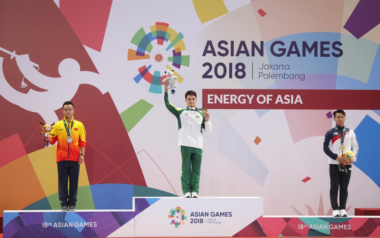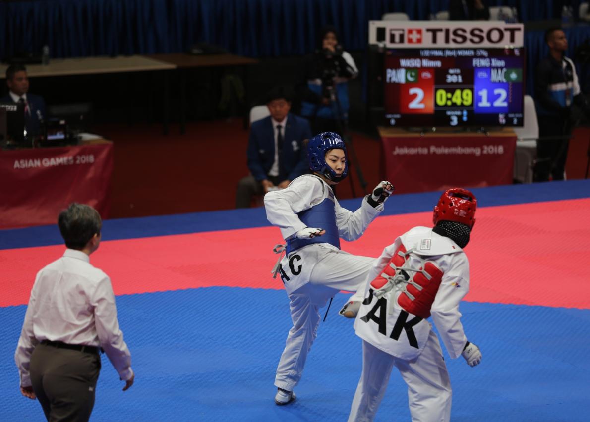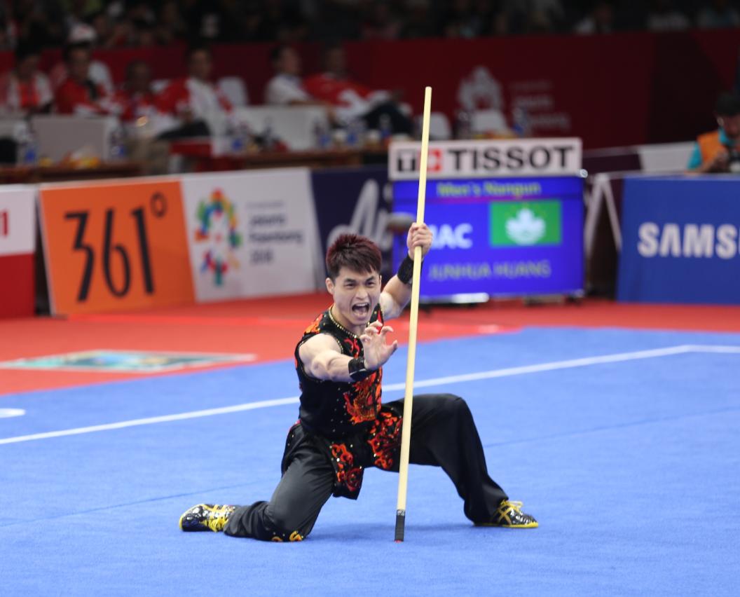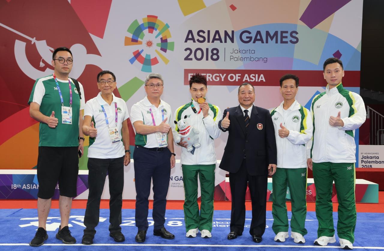 在印尼参加‘第十八届亚洲运动会’的中国澳门体育代表团,今日(21日)在武术项目获取奖牌,黄俊华(HUANG JUNHUA)在男子南拳及南棍全能项目以总分19.43获得金牌,是体育代表团今届亚运会首面奖牌,也是澳门代表团参加亚运会以来第二面金牌。