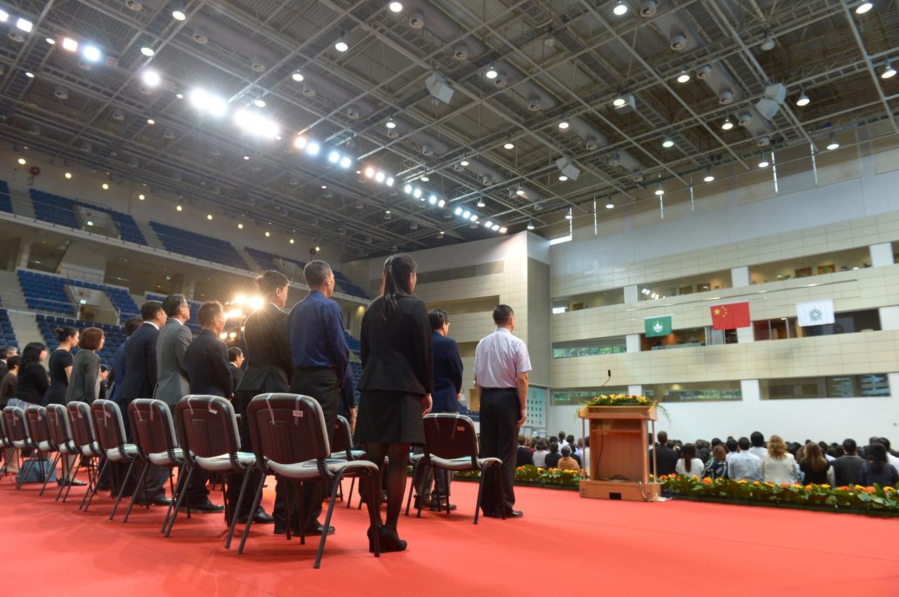 为培养学生爱国爱澳情怀,澳门理工学院于8月29日举行的2018/2019学年开学典礼上进行升国旗仪式。九百多名新生、社会贤达、奖学金机构、海内外大学代表、理工师生员工、校友及家长逾二千人聚首理工体育馆,雄壮的国歌响起,全体人员注目仰望庄严的国旗冉冉升起,共唱国歌,充满对祖国的无比敬仰和自豪。