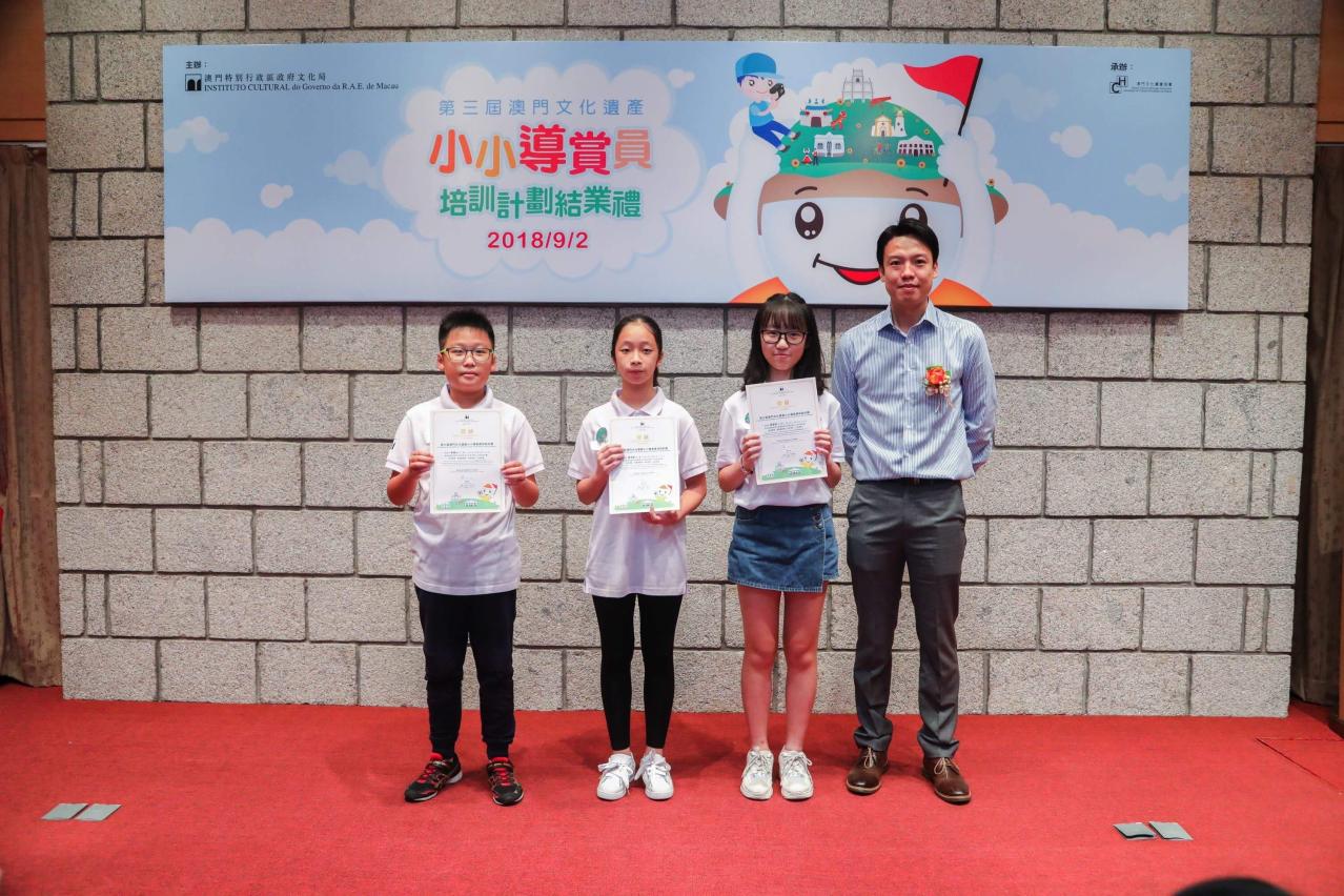 由文化局主办、澳门文化遗产协会承办的“第三届澳门文化遗产小小导赏员培训计划 ”, 日前(九月二日)在澳门博物馆演讲厅举行学员结业典礼。文化局向本届完成培训计划的学员颁发结业证书和“文化局小小导赏员”襟章,并为表扬学习成绩最为优秀的三名学员特别颁发“优异奖”,由导师及学员家长一同见证,现场气氛热烈 。