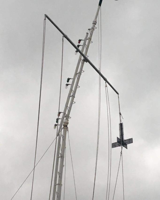 受超强台风山竹影响,位于东望洋灯塔旁的风讯杆上端出现倾斜,可能潜在折断风险,消防已到场围封可能受影响的位置,敬请市民留意,避免接近风讯杆附近位置。