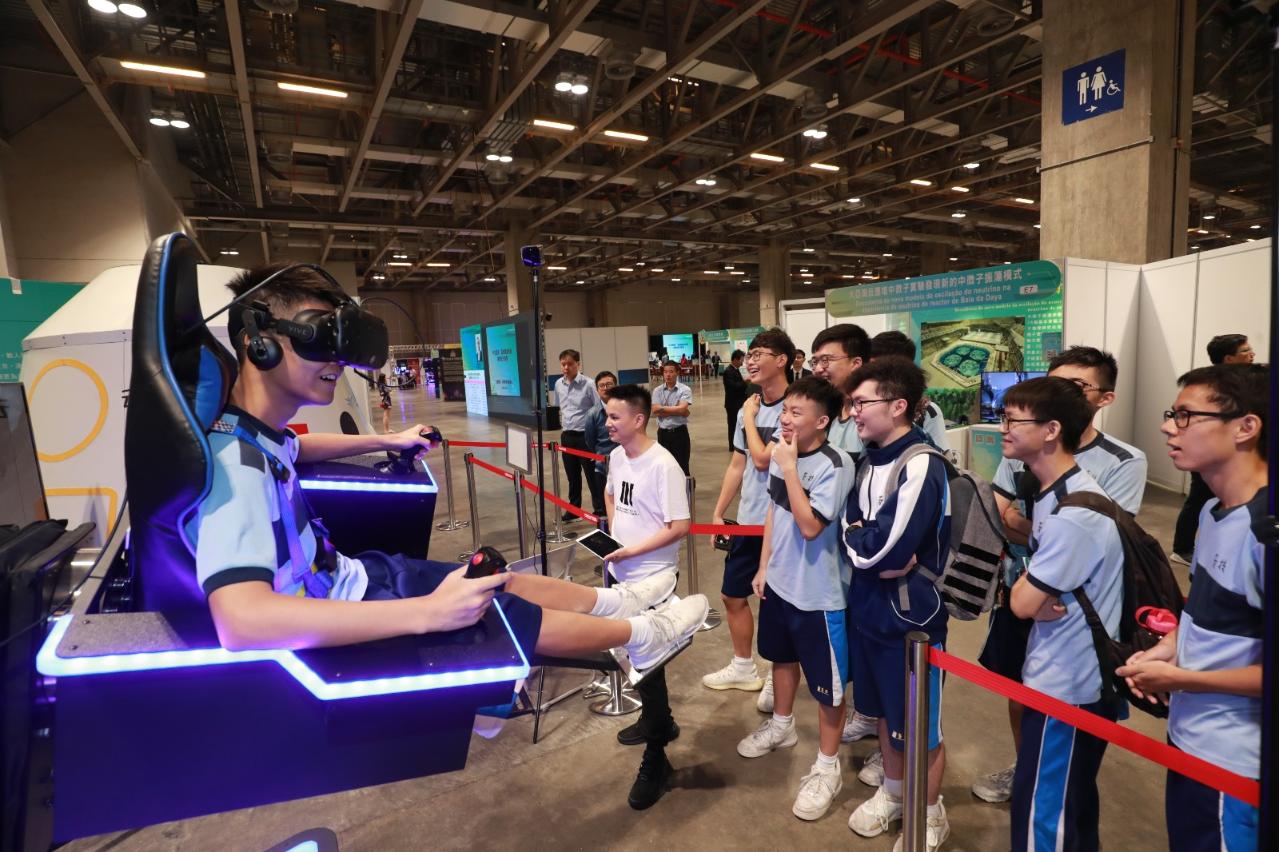 一连五天由科技委员会主办、科学技术发展基金承办的“2018科技周暨中华文明与科技创新展”现正公开展出。今年的科技周活动与“中华文明与科技创新展”的“农”、“工”、“医”系列展品一同展出,内容十分丰富,展出约120项展品。在众多展品中,最受大小朋友欢迎的是虚拟实境(VR)展区。今年我们设置了4个VR展区。其中地震平台尤为最受欢迎,参加者可以登上体验平台、戴上头盔,通过虚拟模拟技术,真实感受地震的“可怕”,平台还可以通过震动频率调整,模拟各级地震,让参加者可以在地震中避难,提高防灾减灾意识。VR飞行器,参加者只需要佩戴上VR头盔,并乘坐座模拟器,就可以身临其境般体验在太空中飞行。座椅还能根据场景进行360旋转,体验“倒竖冲”、“急降”,不少小朋友全情投入,紧张得尖叫。还有让玩家趴在设备上,体验鸟儿高空飞翔的感觉的展品。现场还有很多寓教于乐的VR展品,可以提供前所未有的体验。此外,还有各种互动工作坊、表演等,周末还提供以港珠澳大桥为背景的拍照服务。