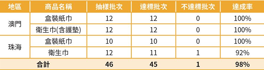 盒装纸巾及卫生巾是生活必需品,澳珠消费者组织合作在两地抽查共46个批次的盒装纸巾及卫生巾样本,其中仅1个批次抽取自珠海市的卫生巾样本未达标,而抽查自本澳各12个批次的盒装纸巾及卫生巾样本全部通过检测标准的要求。