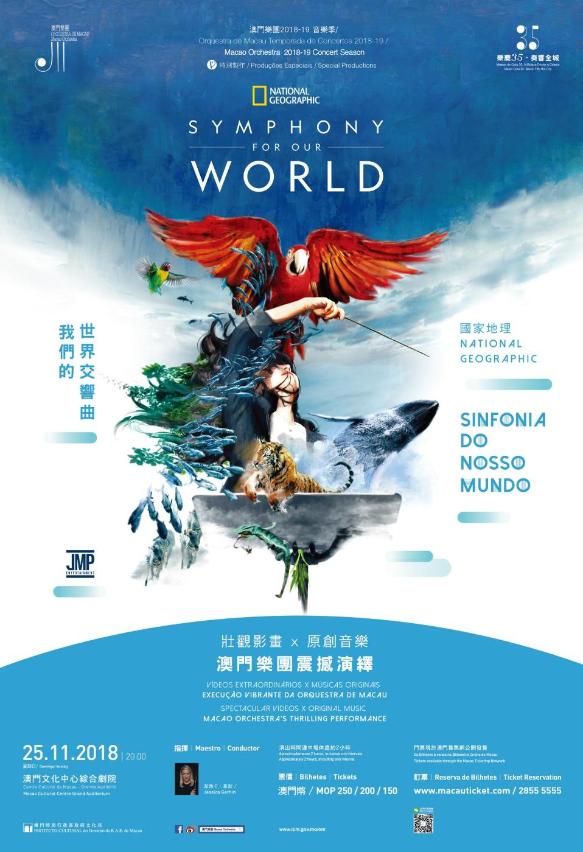 文化局澳门乐团将于11月25日(星期日)晚上8时于澳门文化中心综合剧院举办原创主题交响乐《国家地理──我们的世界交响曲》音乐会,由柏斯交响乐团总指挥暨音乐总监洁西卡.葛钦(Jessica Gethin)率领澳门乐团及香港学士合唱团演出。现剩极少量门票于澳门售票网公开发售,欲购从速,万众期待。