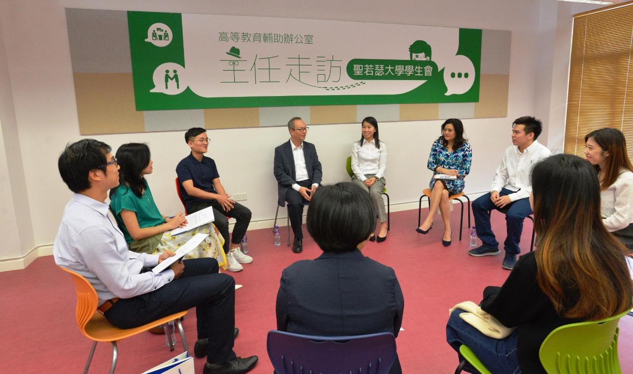 高教办主任苏朝晖率领副主任何丝雅、高校学生辅助组职务主管黄月冰亲身走访圣若瑟大学青洲新校舍,获得圣若瑟大学学生会会员大会主席谭慧瑜、副主席欧阳文浩的热情接待,并在他们的陪同下,参观圣若瑟大学鲍思高礼堂、学生会办公室,瞭解学生会日常运作情况。