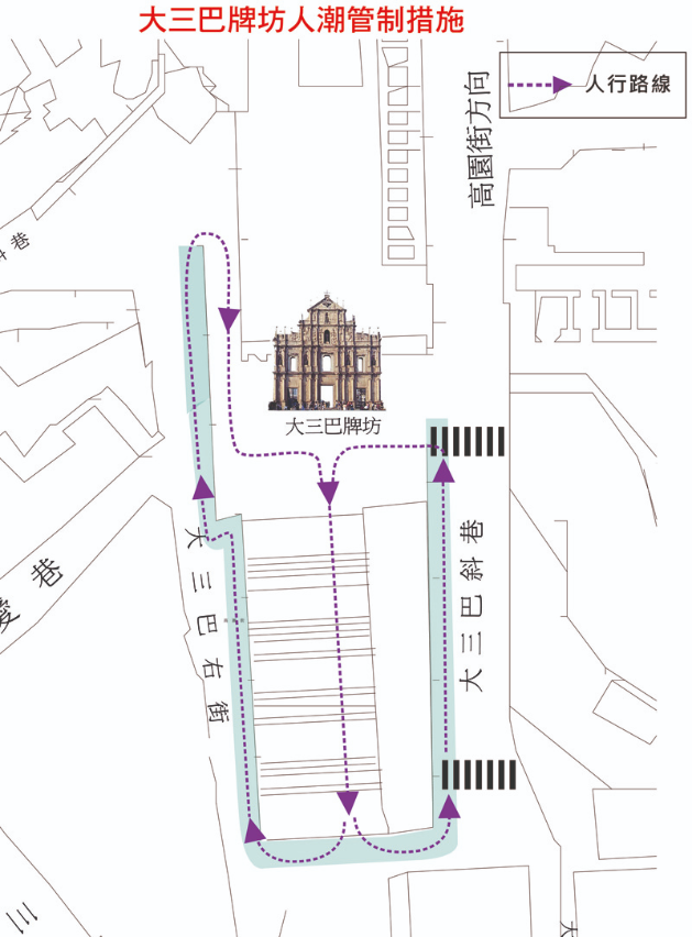 当大三巴街(手信街)人群出现挤拥时,将会实施单向人潮管制措施,人流只可单向上行往牌坊,并取道周边的街巷如大关斜巷、关前后街、高园街等离开。