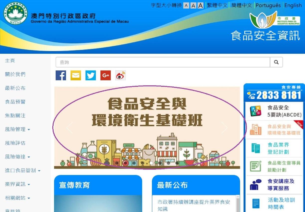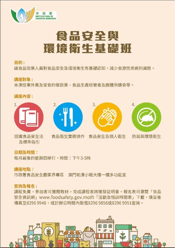 「食品安全与环境卫生基础班」欢迎食品业界及公众踊跃报读,可登入食品安全资讯网页www.foodsafety.gov.mo下载及填妥报名表格,并由即日起至二月二十五日透过电邮 dir-info@iam.gov.mo、传真8296 9948,或于办公时间递交至佑汉小贩大楼一楼市政署食品业界专区及市政署各区服务中心报名。课程费用全免,名额有限,额满即止。如有疑问,可于办公时间内致电8296 9856或8296 9951查询。另外,上述课程教材及讲授内容亦已上载至食品安全资讯网页及食安资讯手机应用程式,以方便业界查阅。